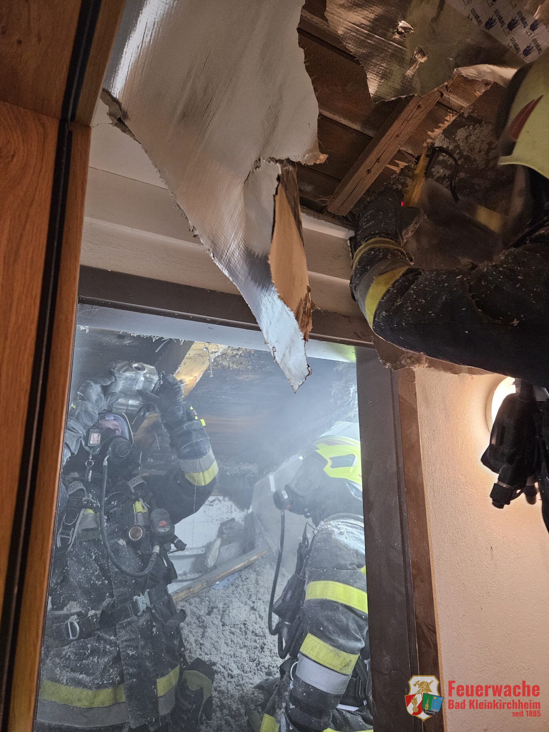 Für die weitere Kontrolle und Nachlöscharbeiten mussten zusätzliche Teile der Dachkonstruktion geöffnet werden. Insgesamt standen zwei Atemschutztrupps der Feuerwehr Bad Kleinkirchheim im Einsatz.