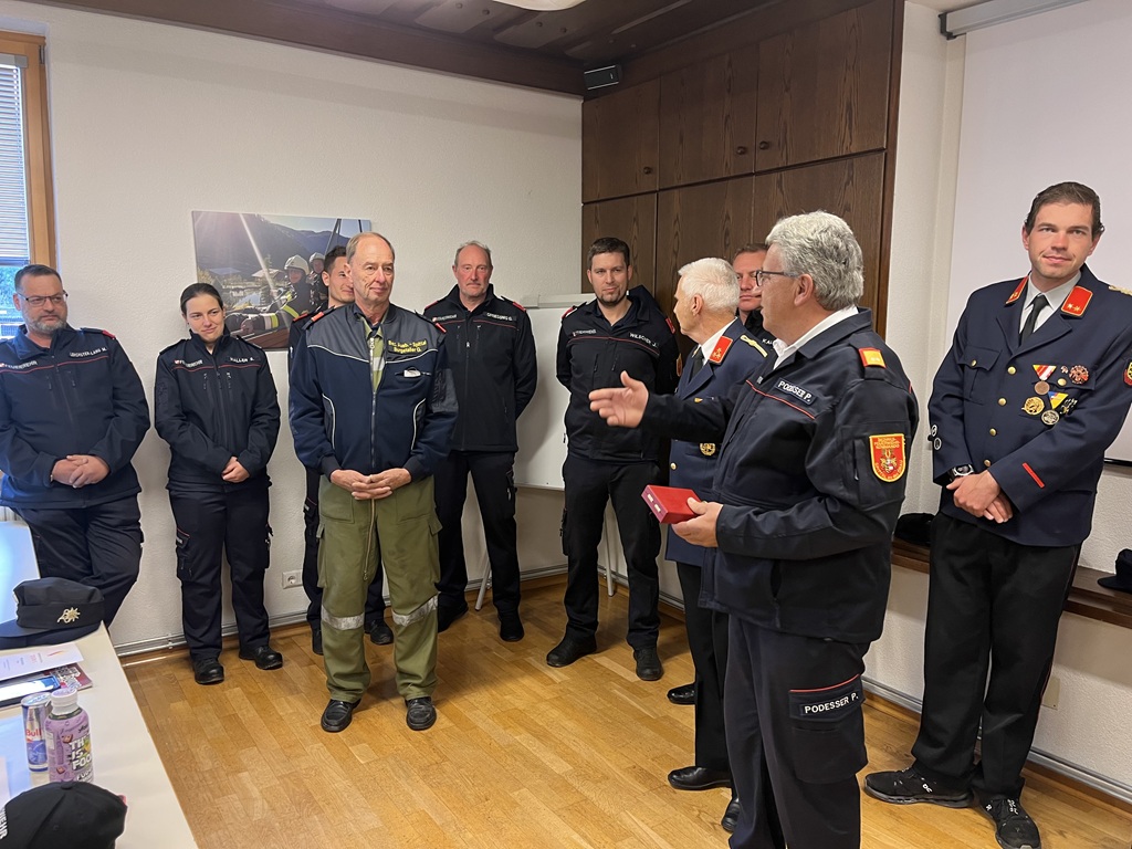 Im Rahmen des Abschlusses wurde Brandinspektor Gustav Burgstaller für seine langjährige und engagierte Tätigkeit als Ausbildner und Ausbildungsleiter im Bezirk Spittal geehrt. Die Ehrung wurde von Bezirksfeuerwehrkommandant-Stellvertreter Peter Podesser vorgenommen, der in seiner Ansprache die herausragenden Verdienste Burgstallers um die Ausbildung der Feuerwehrmitglieder im Bezirk würdigte und ihm für seinen jahrzehntelangen Einsatz dankte.