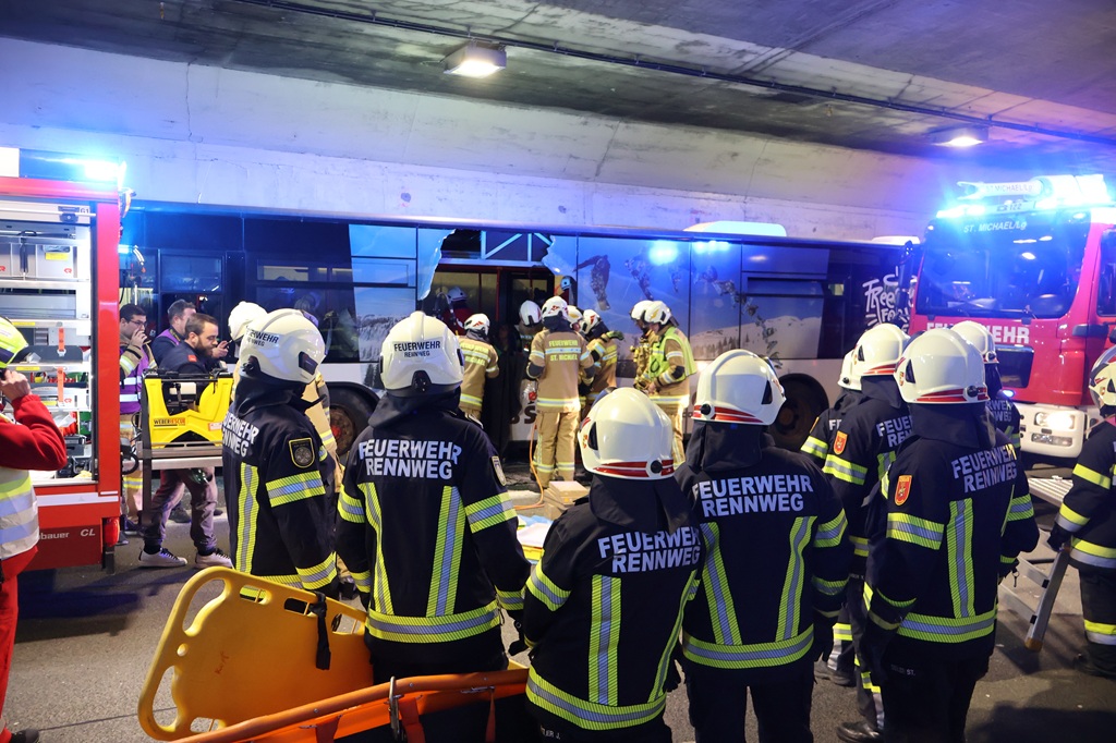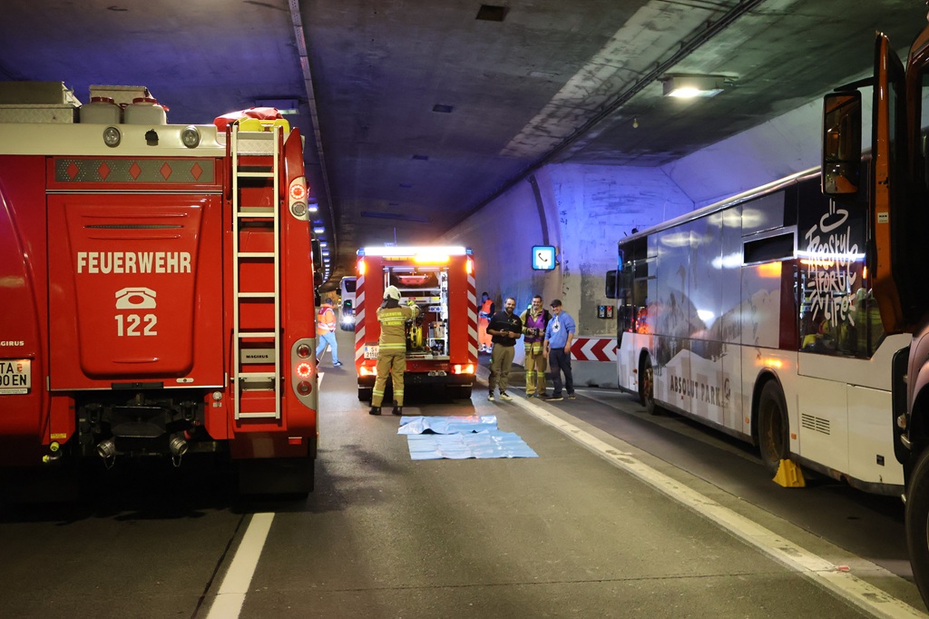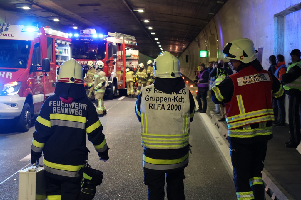 Nach der Alarmierung rückten die Feuerwehren beider Tunnelportale zeitgleich an und arbeiteten sich von den jeweiligen Portalen in Richtung der Unfallstelle vor. Nach der Erkundung wurde die Unfallstelle abgesichert, die Beleuchtung aufgebaut und die Zusammenarbeit mit den Rettungskräften koordiniert. Parallel dazu wurden die Verletzten versorgt, betreut und geordnet aus dem Tunnel gebracht.