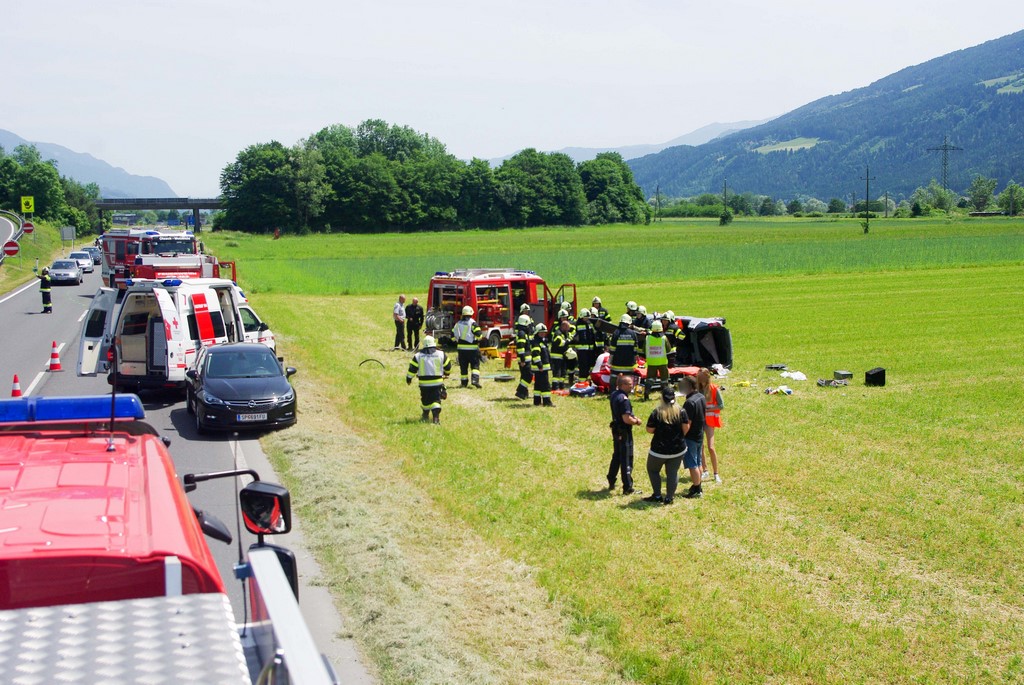 Ein Auto war in Richtung Spittal fahrend von der B100 abgekommen und seitlich liegend im Feld zum Stillstand gekommen. Mindestens eine Person war noch im Wrack eingeklemmt.