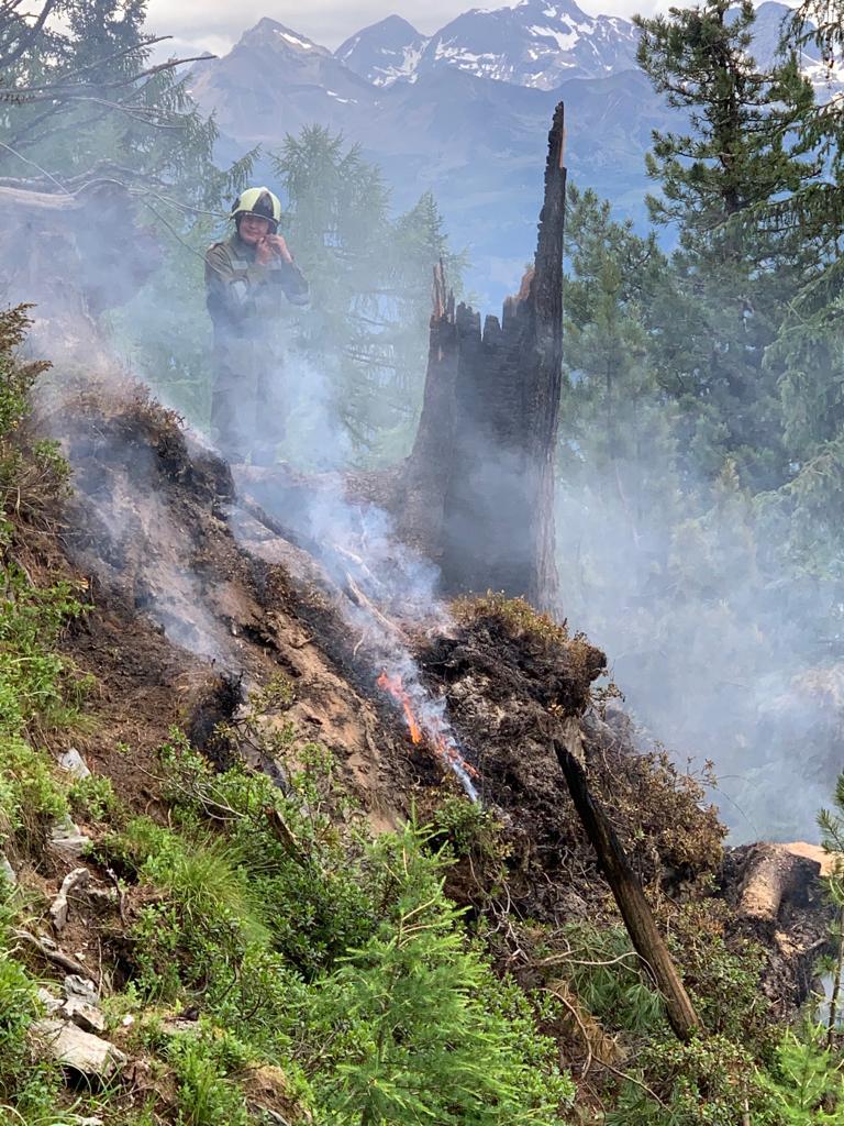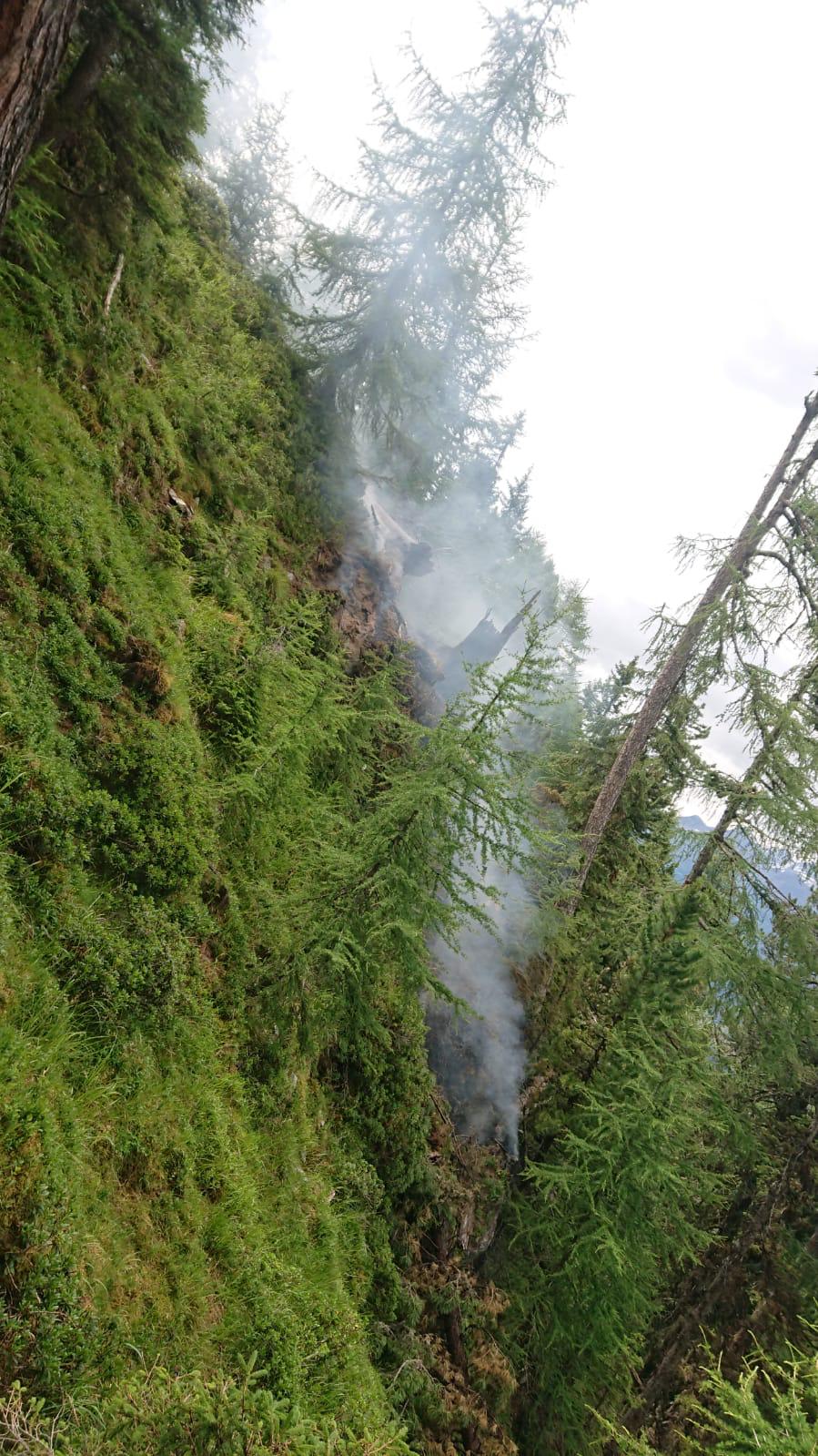 Nach einer beschwerlichen und über 1 Stunde dauernden Zufahrt für die Einsatzkräfte wurde festgestellt dass auf einer Seehöhe von 2200 Meter ein kleinflächiger Waldbrand ausgebrochen war.