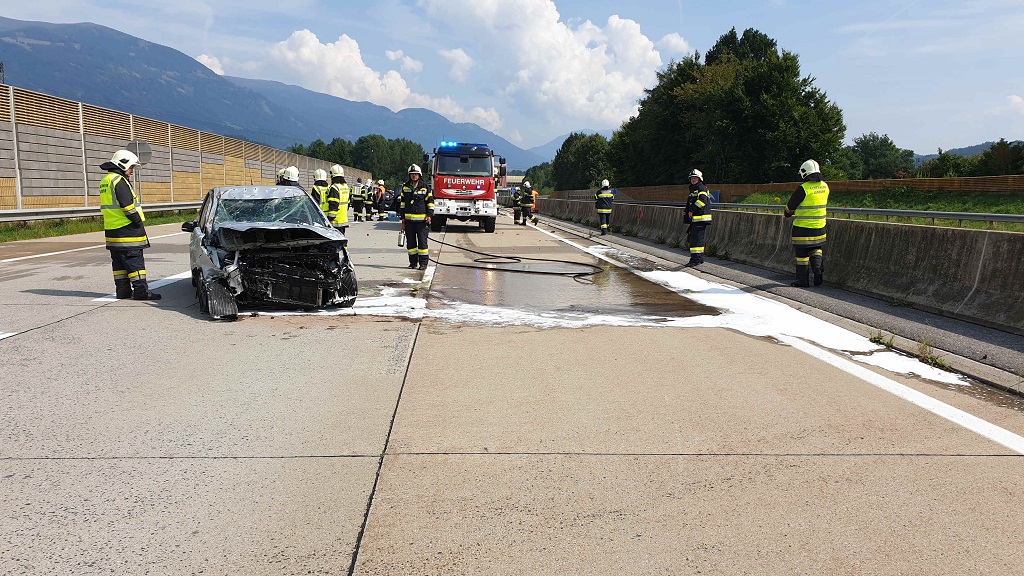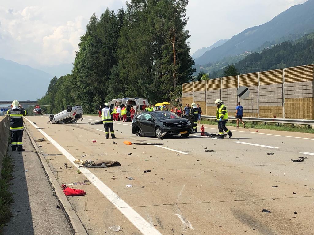 Auf der Autobahn Richtung Lendorf Höhe Einbiegespur Gmünd kam es zu einem folgenschweren Verkehrsunfall. 2 Fahrzeuge sind aus unbekannter Ursache zusammengestoßen. Ein Fahrzeug hat sich dabei Überschlagen und kam am Dach liegend zum Stillstand.