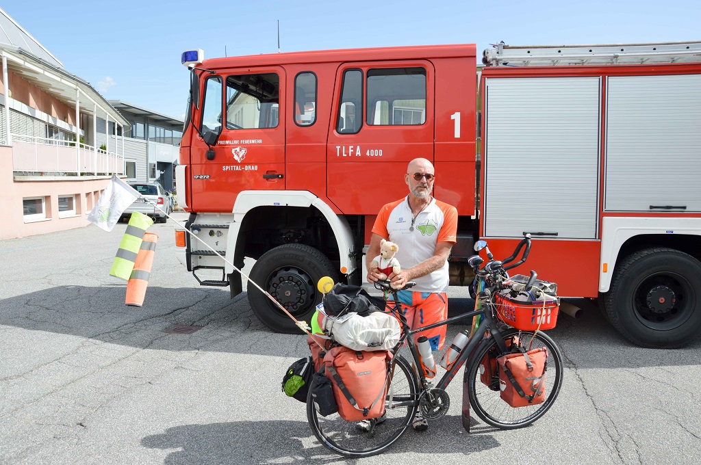 Jörg Richter radelte für einen guten Zweck schon einmal 7.700 Kilometer in den USA von der Ost- zur Westküste. Dieses Mal durchquert der Feuerwehrkamerad und Hobbysportler aus Würzburg mit seinem Rad alle Länder rund um Deutschland. Sein Weg durch Kärnten führt ihn über Wolfsberg und Villach nach Spittal.