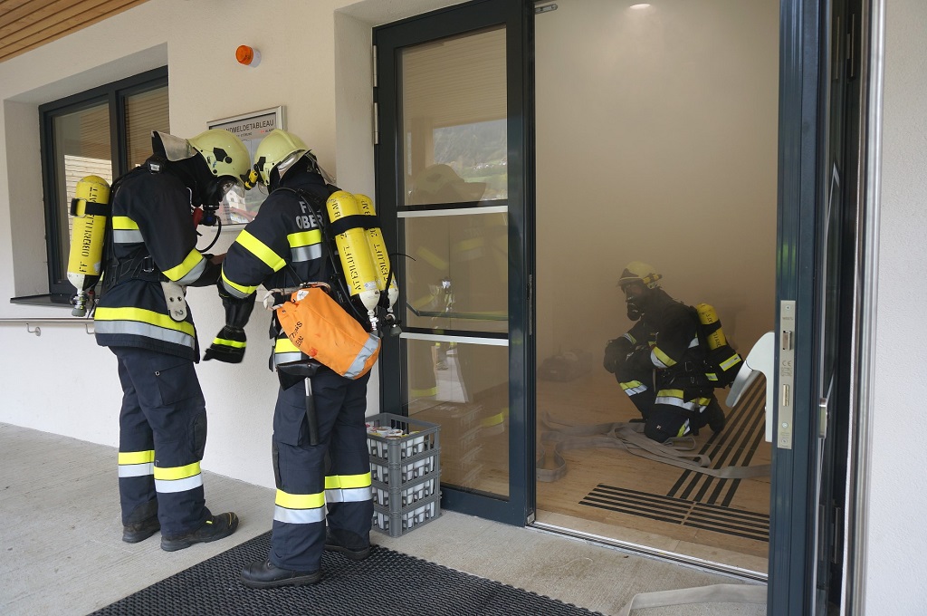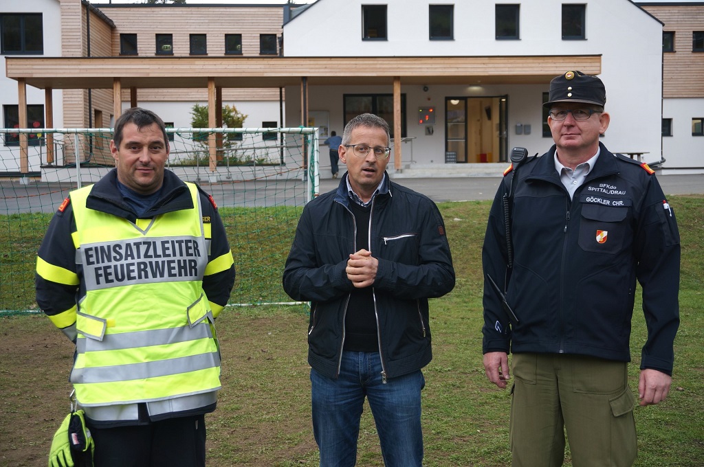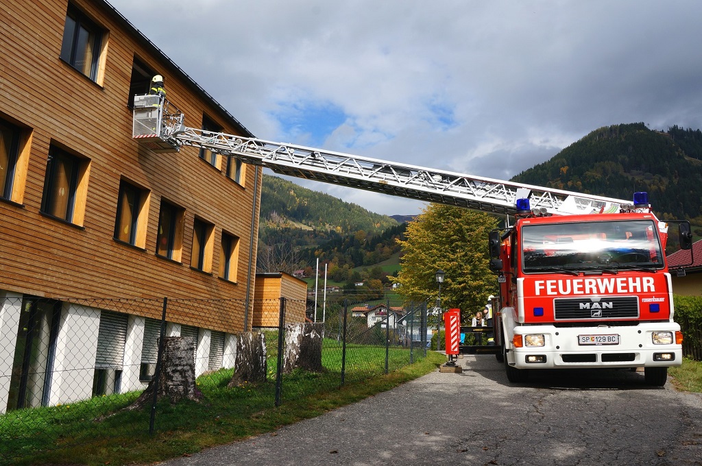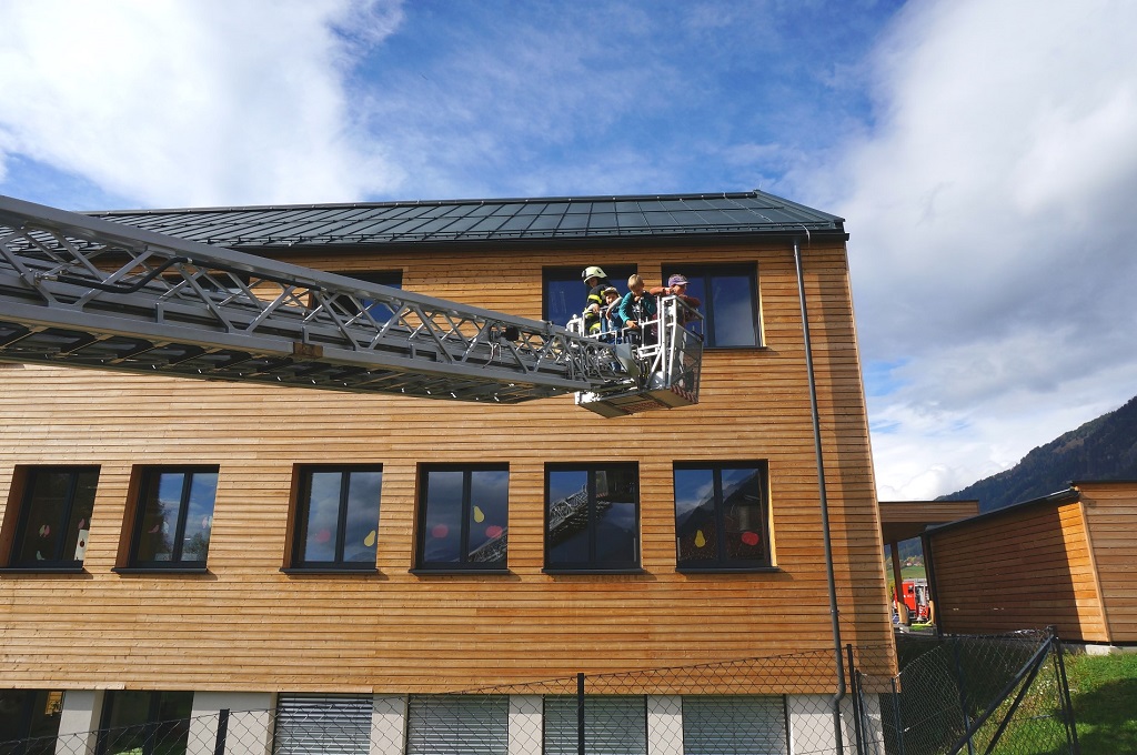 Mehrer Atemschutz-Trupps mussten in der Folge zugleich die Erkundung, Personenrettung und Brandbekämpfung durchführen. Bei der Übungs-Alarmierung wurde auch zeitgleich die Drehleiter aus Spittal angefordert womit in kurzer Zeit die Kinder und Lehrkräfte aus den oberen Stockwerken evakuiert werden konnten! Es galt in Summe 64 Kinder und sieben Personen des Lehrpersonals unter ständiger Begleitung und Aufsicht sicher den Rettungskräften am Sammelplatz zu übergeben.