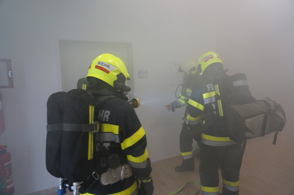 Übungsannahme war ein Küchenbrand im Erdgeschoß, das mit einem Dico-Nebelgerät verrauchte Stiegenhaus war daher für die Kinder und Lehrkräfte nicht mehr begehbar!