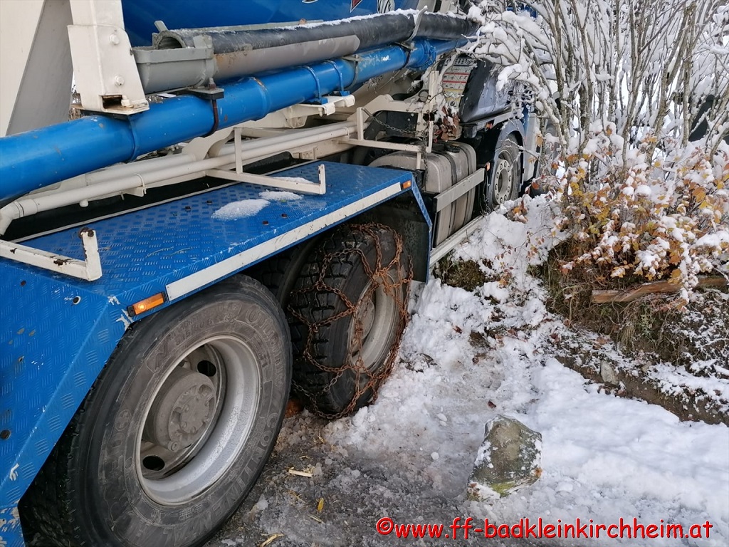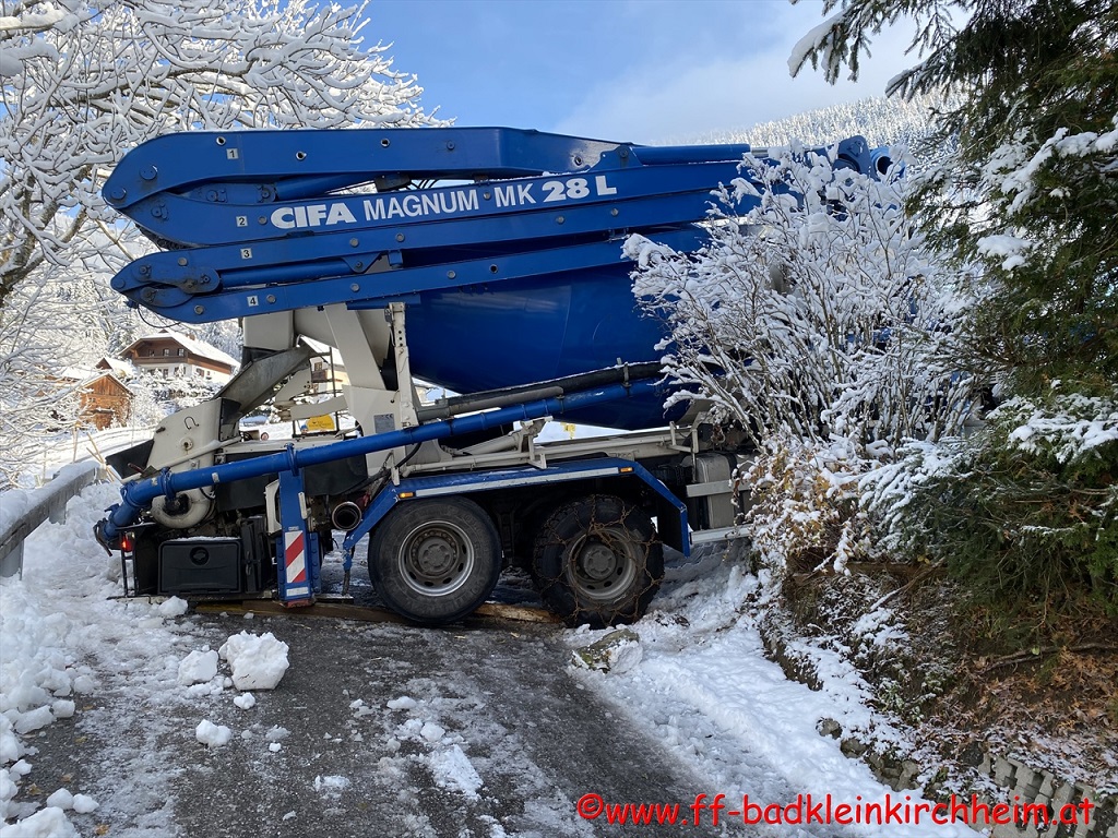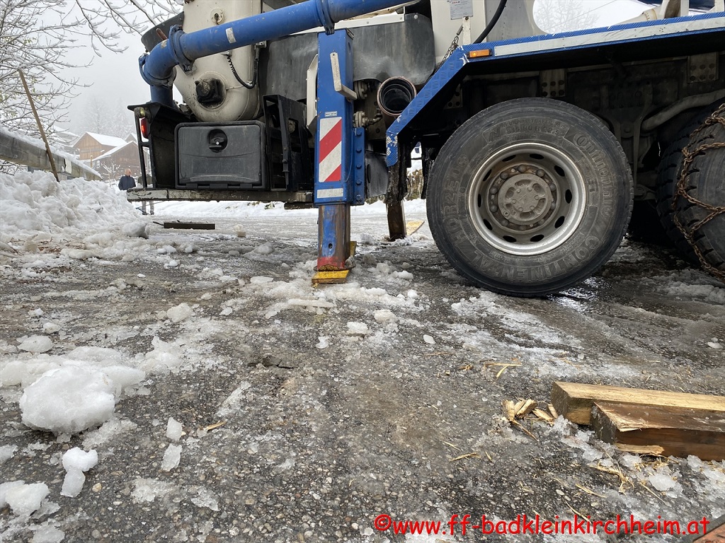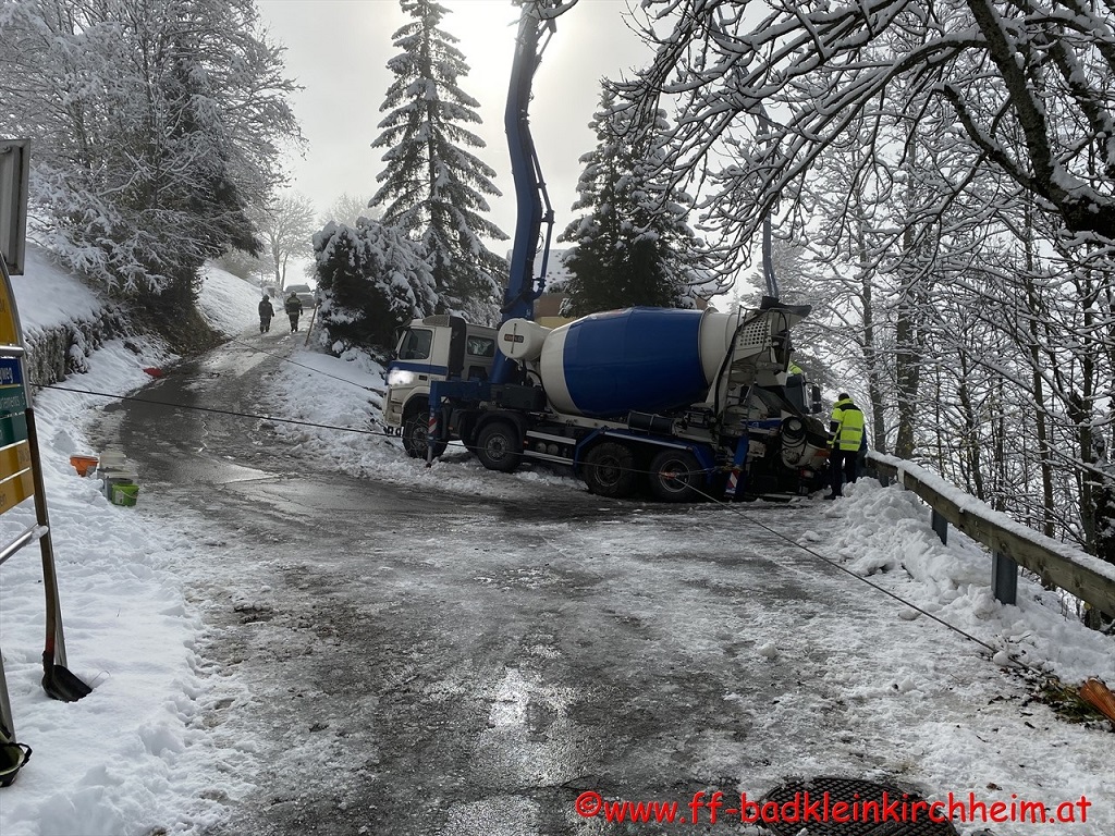 In einer stark geneigten Kurve rutschte ein 4-Achs LKW (Fahrmischerpumpe, Eigengewicht 24 Tonnen und 8 Tonnen Beton) aufgrund der Schneefahrbahn und des Umstandes, dass der LKW zunächst keine Schneeketten aufgelegt hatte, im hinteren Fahrzeugbereich von der Fahrbahn ab. Eine kleine Mauer in der Kurveninnenseite stoppte den LKW und verhinderte ein weiteres Abrutschen. Aufgrund des enormen Gewichtes des LKW‘s von 32 Tonnen ordnete der Einsatzleiter zunächst ein Umpumpen des Betons in einen anderen Betonmischer an. Bis der zweite Betonmischer vor Ort eintraf, wurde mit zwei Greifzügen eine Sicherung des LKW‘s hergestellt. Bei einem Greifzug, der in Folge für die Bergung herangezogen werden sollte, wurde zur Erhöhung der Zugkraft eine lose Rolle eingebaut. Als Anschlagpunkte diente eine Freilandverankerung, die an Leitschienensteher rückversichert wurde, sowie ein Traktor bzw. ein Baum.