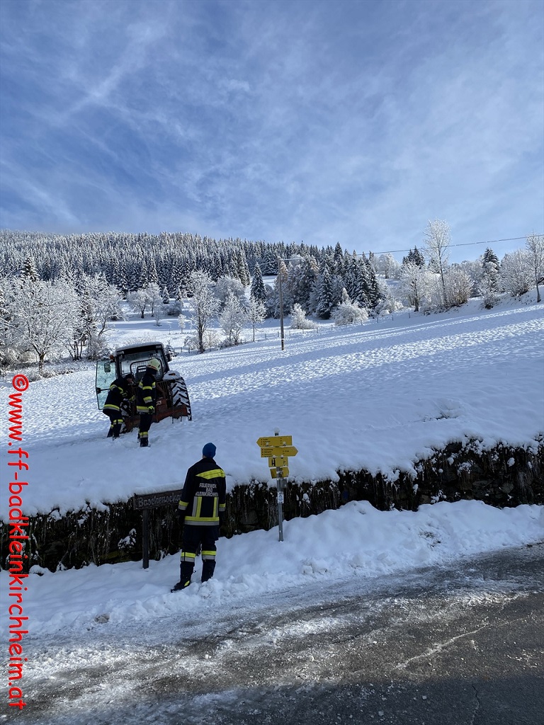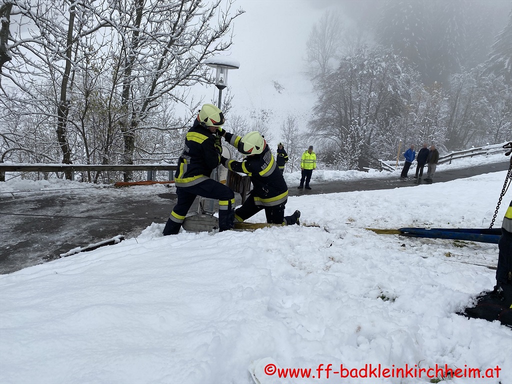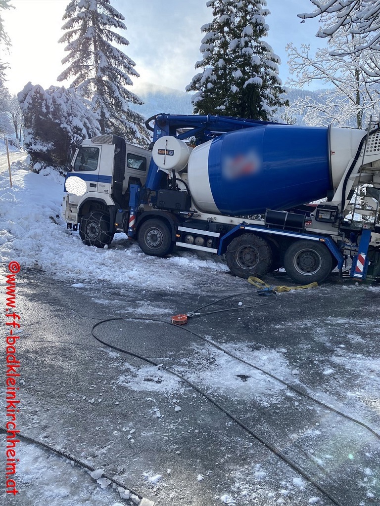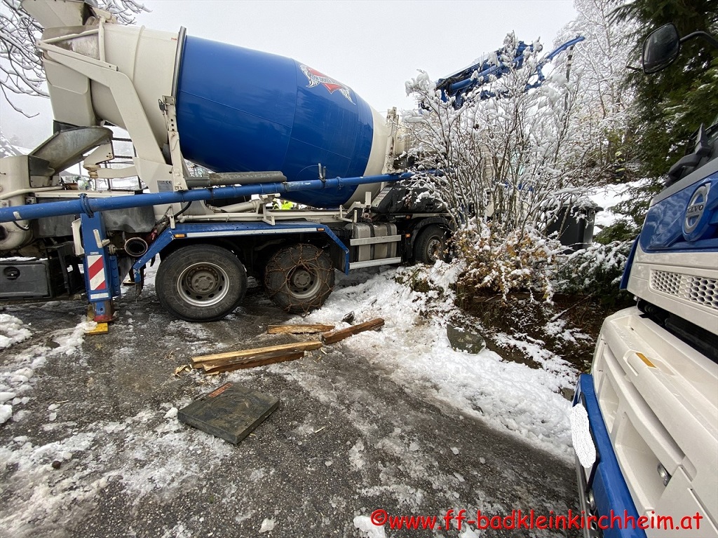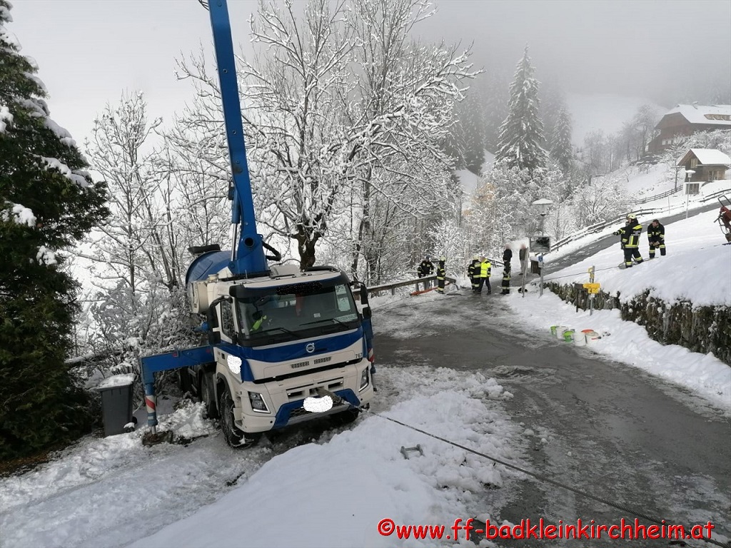 In einer stark geneigten Kurve rutschte ein 4-Achs LKW (Fahrmischerpumpe, Eigengewicht 24 Tonnen und 8 Tonnen Beton) aufgrund der Schneefahrbahn und des Umstandes, dass der LKW zunächst keine Schneeketten aufgelegt hatte, im hinteren Fahrzeugbereich von der Fahrbahn ab. Eine kleine Mauer in der Kurveninnenseite stoppte den LKW und verhinderte ein weiteres Abrutschen. Aufgrund des enormen Gewichtes des LKW‘s von 32 Tonnen ordnete der Einsatzleiter zunächst ein Umpumpen des Betons in einen anderen Betonmischer an. Bis der zweite Betonmischer vor Ort eintraf, wurde mit zwei Greifzügen eine Sicherung des LKW‘s hergestellt. Bei einem Greifzug, der in Folge für die Bergung herangezogen werden sollte, wurde zur Erhöhung der Zugkraft eine lose Rolle eingebaut. Als Anschlagpunkte diente eine Freilandverankerung, die an Leitschienensteher rückversichert wurde, sowie ein Traktor bzw. ein Baum.