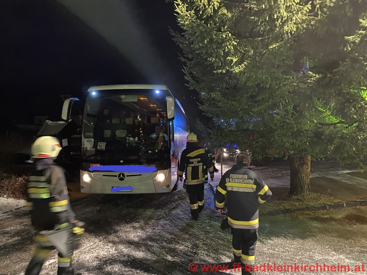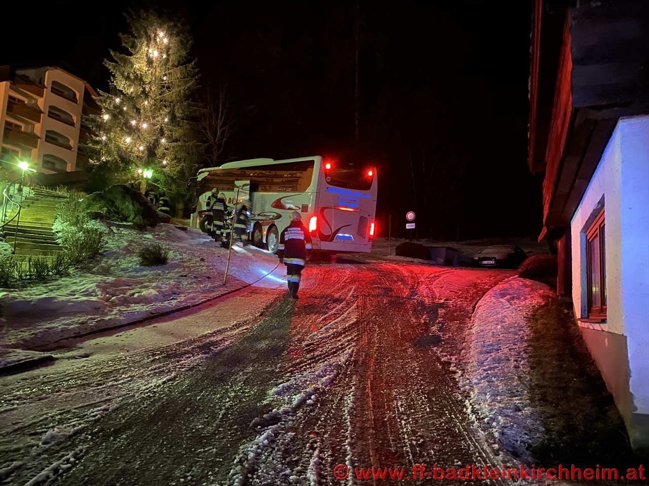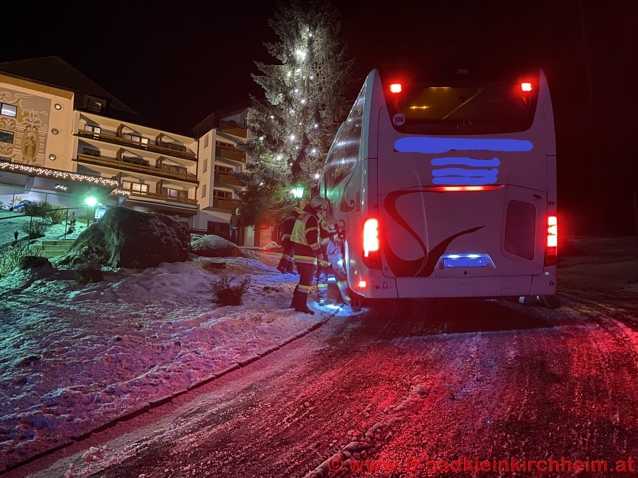 Zum 3. Einsatz am 21. Dezember 2019 wurde die Feuerwehr Bad Kleinkirchheim um 21.23 Uhr alarmiert. Ein Reisebus war auf einer recht rutschigen Hotelzufahrt in Notlage geraten.