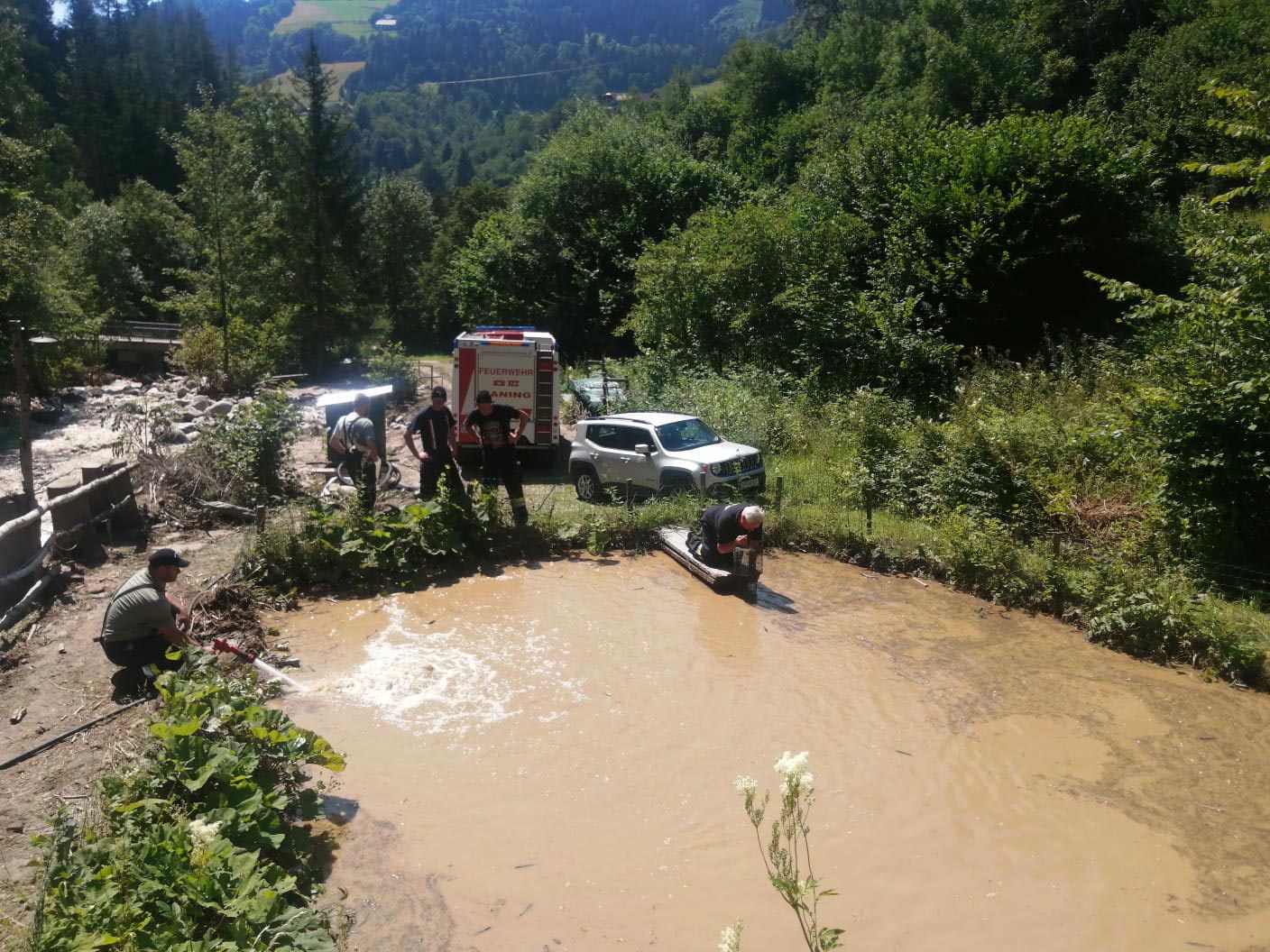 Am Samstag, dem 01.08.2020 rückten um 9:30 Uhr einige Kameraden zum Erlacherhaus im Langalmtal aus, um das Fahrzeug, welches von den Wassermassen am Mittwochabend mitgerissen wurde, zu bergen. Der PKW musste zuerst von Sand und Steinen befreit werden, dabei konnten einige Wertgegenstände, Bargeld sowie die Pässe der beiden holländischen Urlauber fast unversehrt gerettet werden. Anschließend wurde das Fahrzeug mithilfe von zwei Traktoren geborgen. Im Einsatz standen sechs Mann der FF Kaning mit LFA und zwei Traktoren mit Seilwinde. Die Einsatzbereitschaft konnte nach 4 Stunden wiederhergestellt werden.