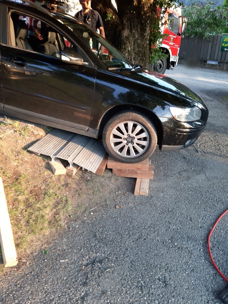 Da das Fahrzeug auf der Böschungskante aufsaß, musste der PKW mit einem Hebekissen angehoben und in weitere Folge ein entsprechender Unterbau mit Rüsthölzern und einer Schlauchbrücke errichtet werden.