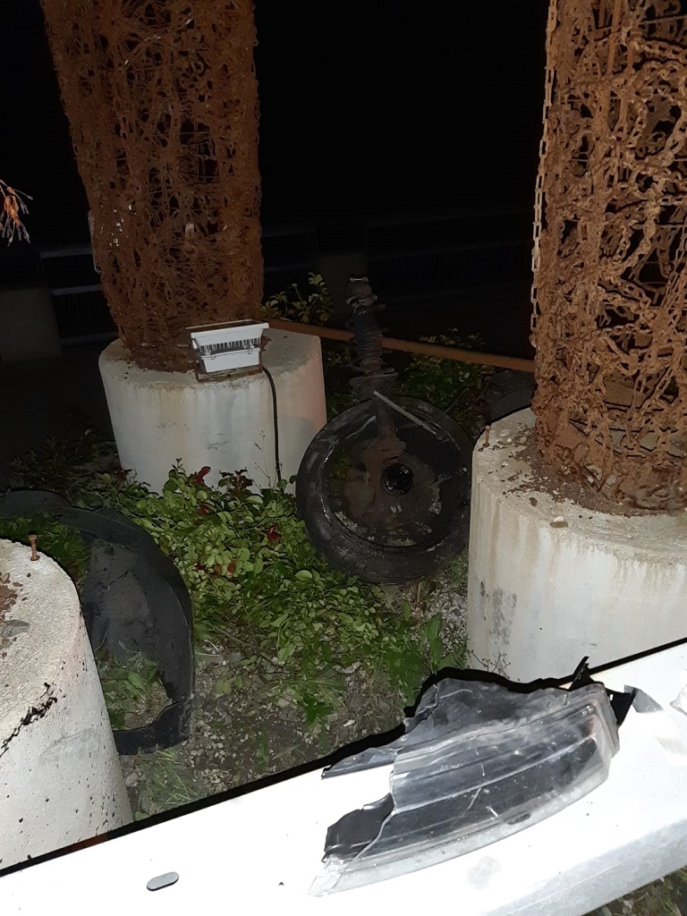 Großes Glück hatten dabei einige Personen welche sich zu diesem Zeitpunkt auf dem direkt unter der Unfallstelle verlaufenden Rad-/Gehweg befanden. Wäre die Radaufhängung nicht durch Skulptur gestoppt worden, wäre diese direkt auf die Personen geschleudert worden.