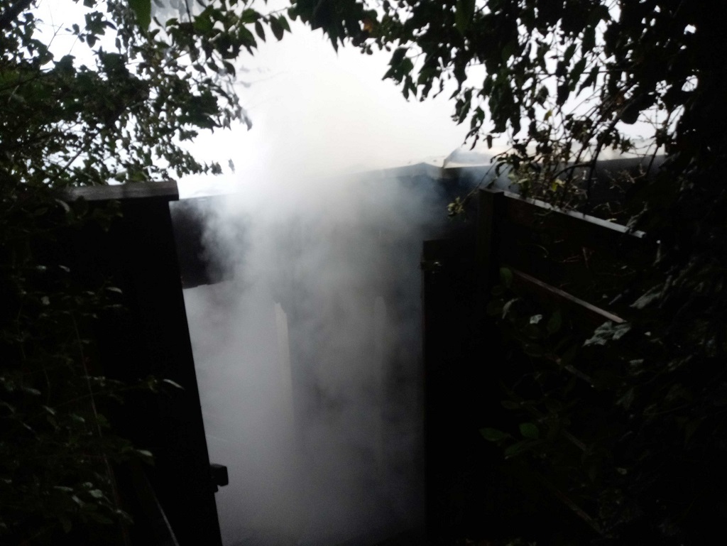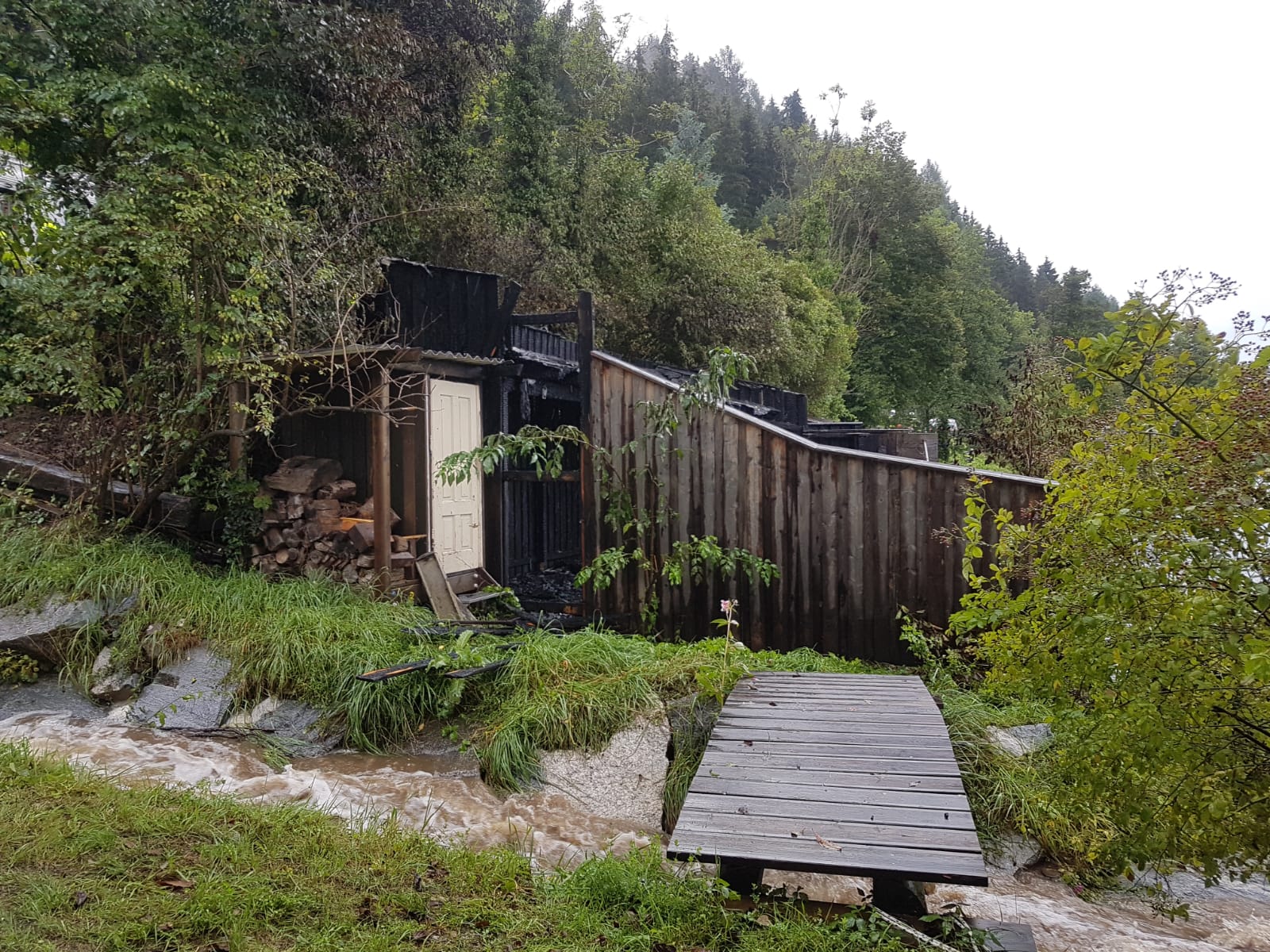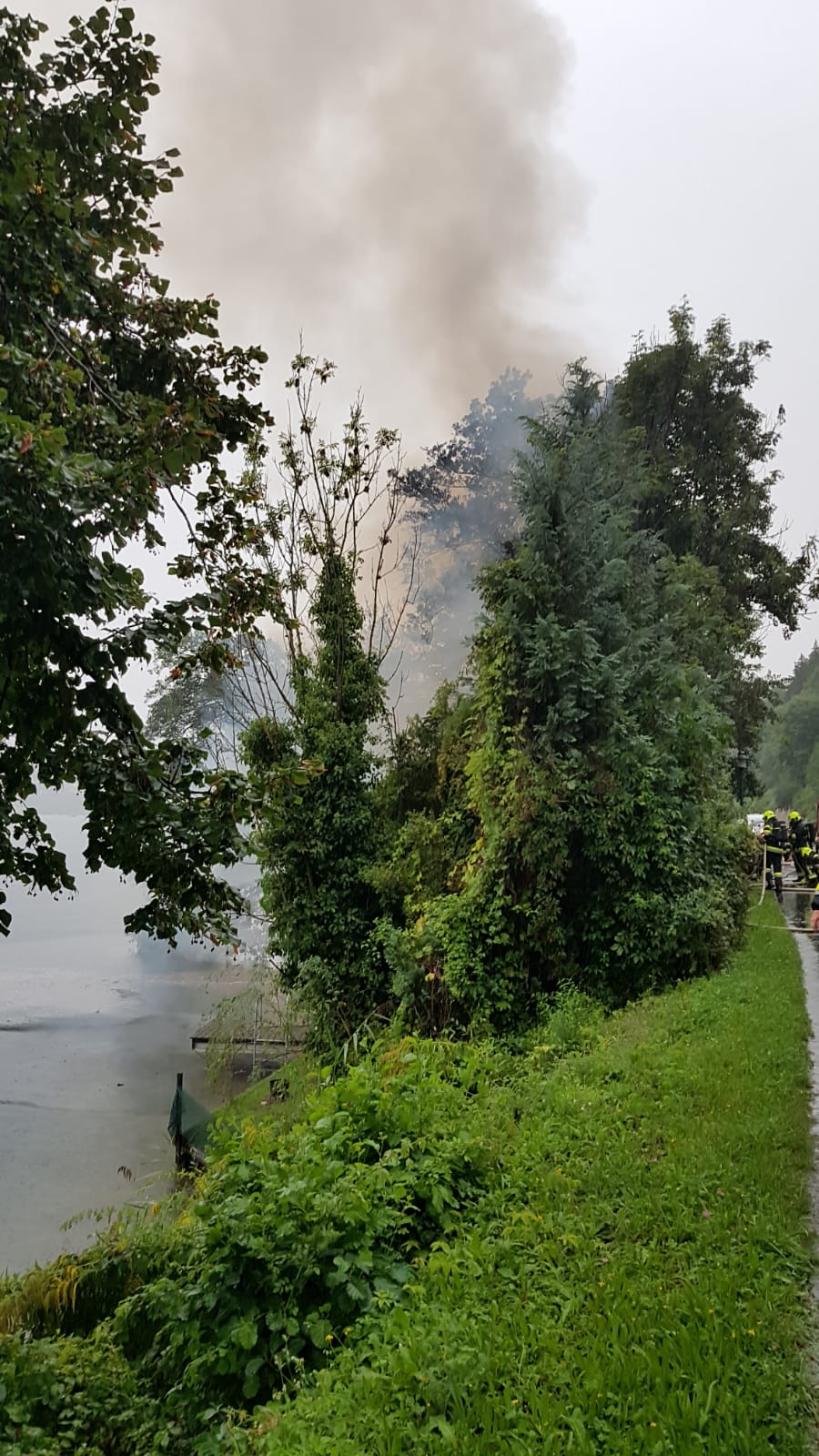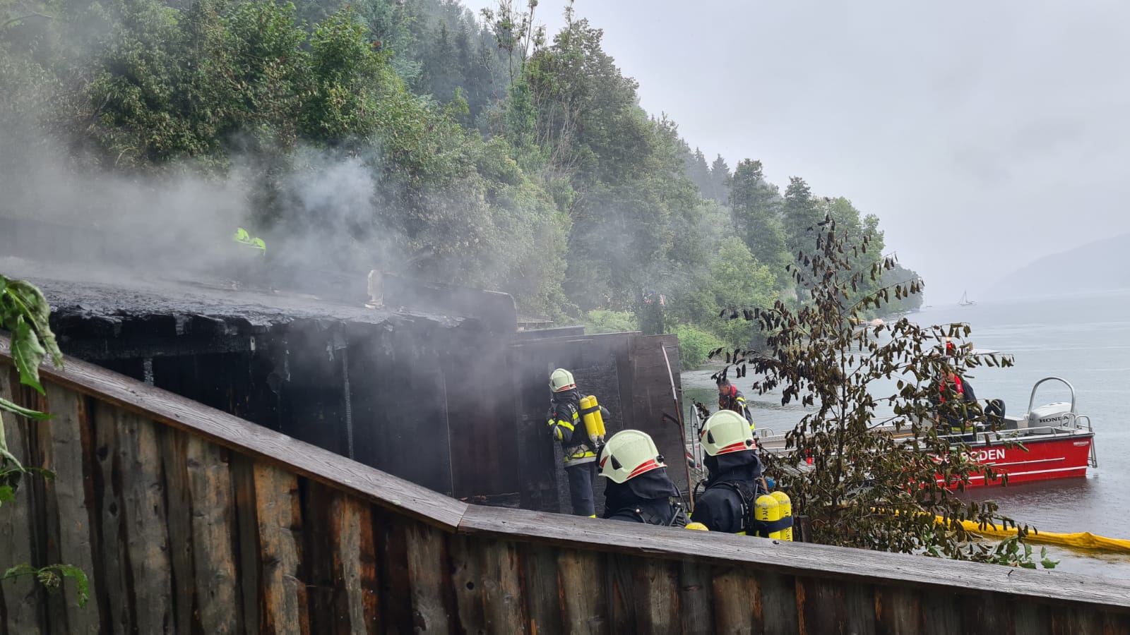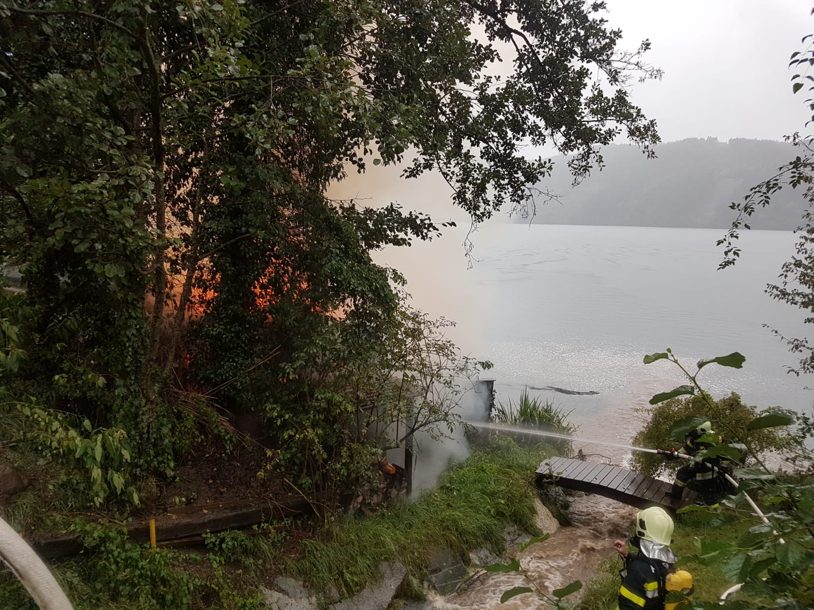 Beim Eintreffen an der Einsatzstelle stand die Badehütte bereits in Vollbrand und der Brand drohte auf die angrenzenden Bäume überzugreifen. Aus diesem Grund wurde auch noch Sirenenalarm für die Feuerwehr Seeboden ausgelöst.