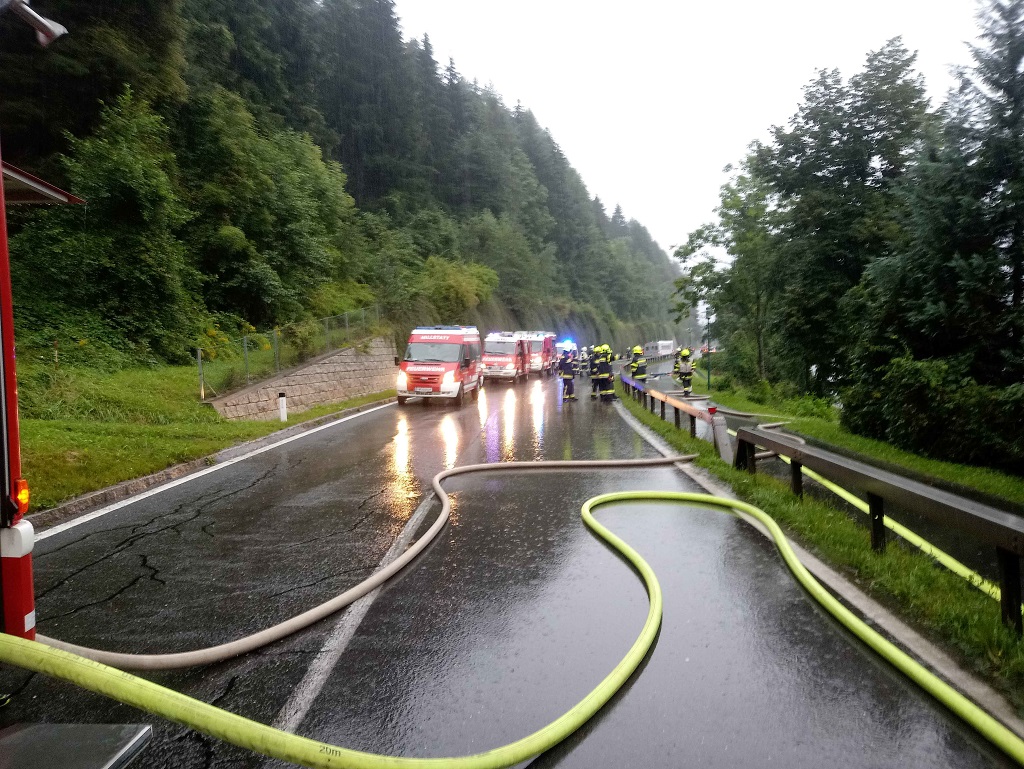 Es stellte sich heraus, dass sich die Einsatzörtlichkeit nicht in der Nähe des KAP 4613 befand, sondern direkt auf der Gemeindegrenze zwischen Millstatt und Seeboden. Da sich zu diesem Zeitpunkt noch einige Kameraden der Feuerwehr Seeboden aufgrund vorheriger Einsatztätigkeiten im Zuge des Unwetters im Rüsthaus befanden, rückten diese nach Absprache mit den alarmierten Kräften ebenfalls unverzüglich mit dem TLFA 4000 zur Einsatzstelle aus.