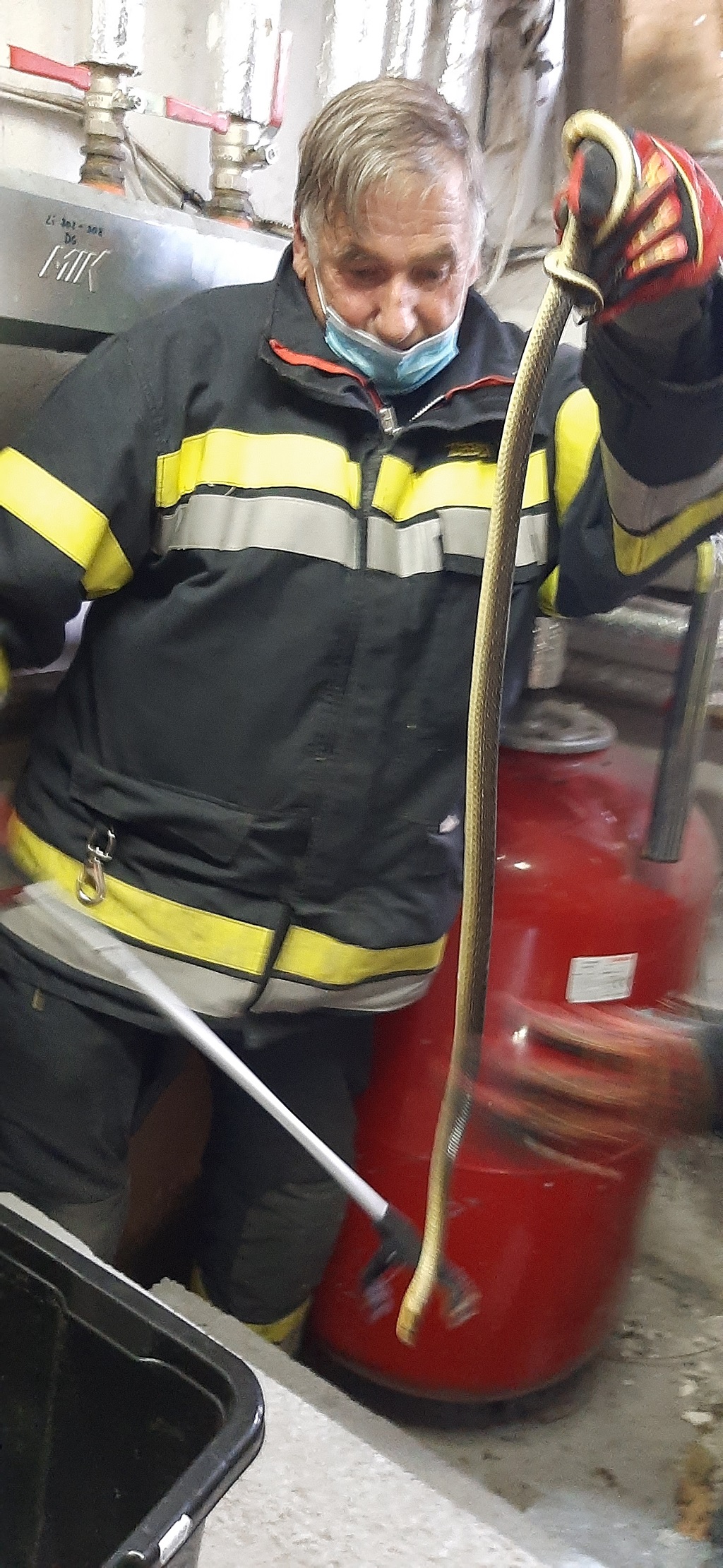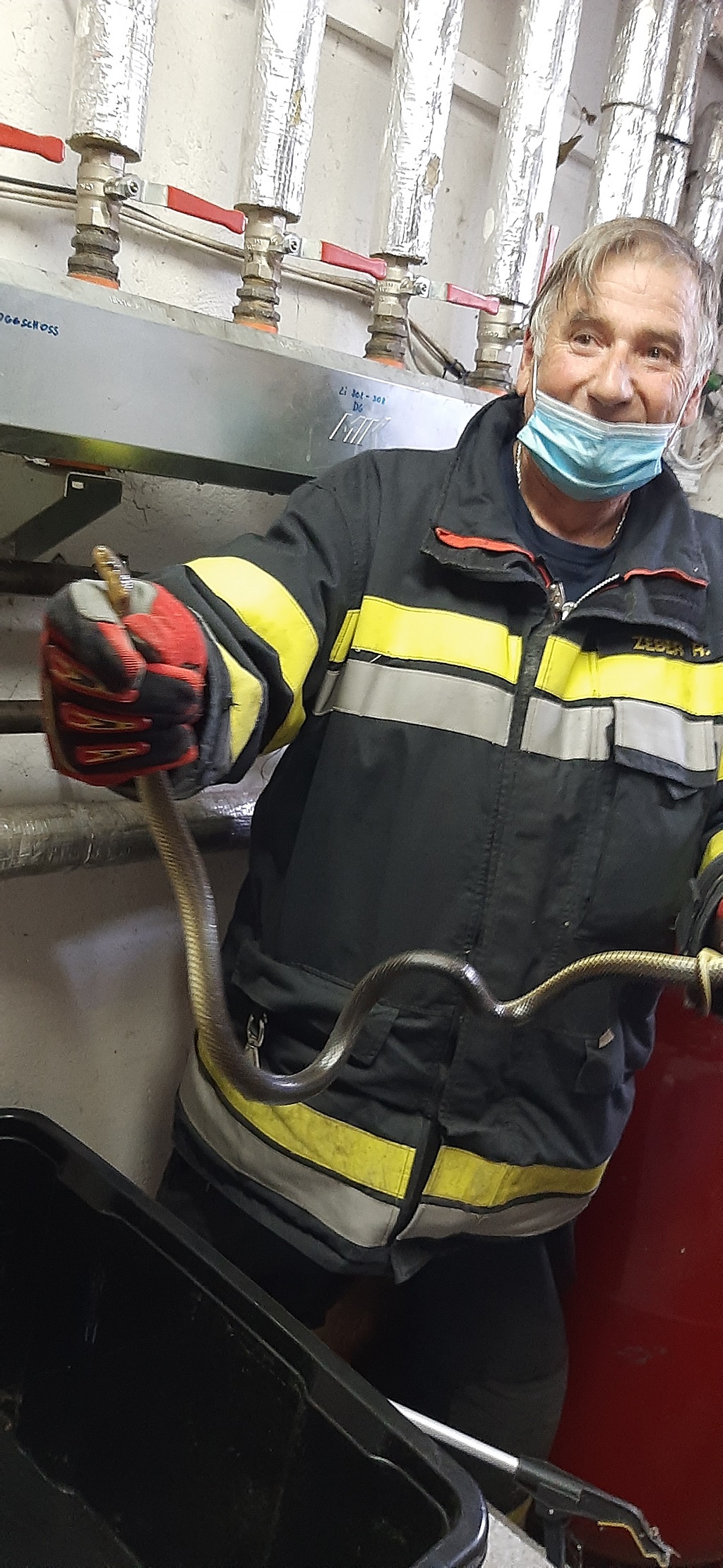 Im Heizkeller eines Hotelbetriebes hatte es sich eine Schlange gemütlich gemacht. Nach längerer Suche und Abbau eines Technikschrankes konnte das Tier schließlich gefunden und eingefangen werden.