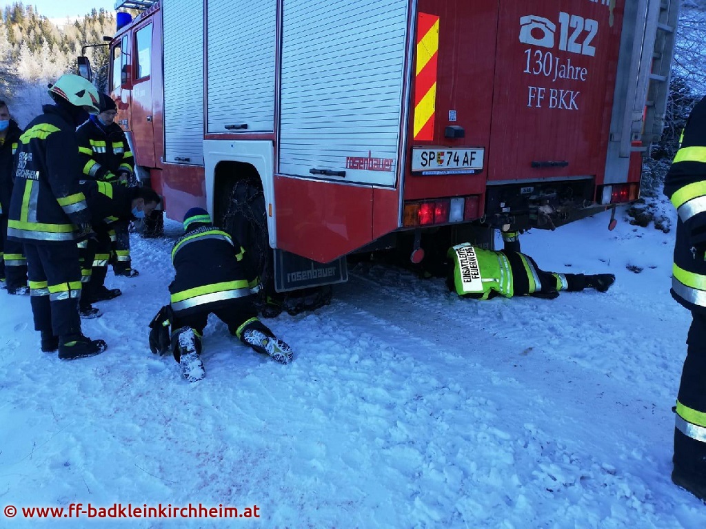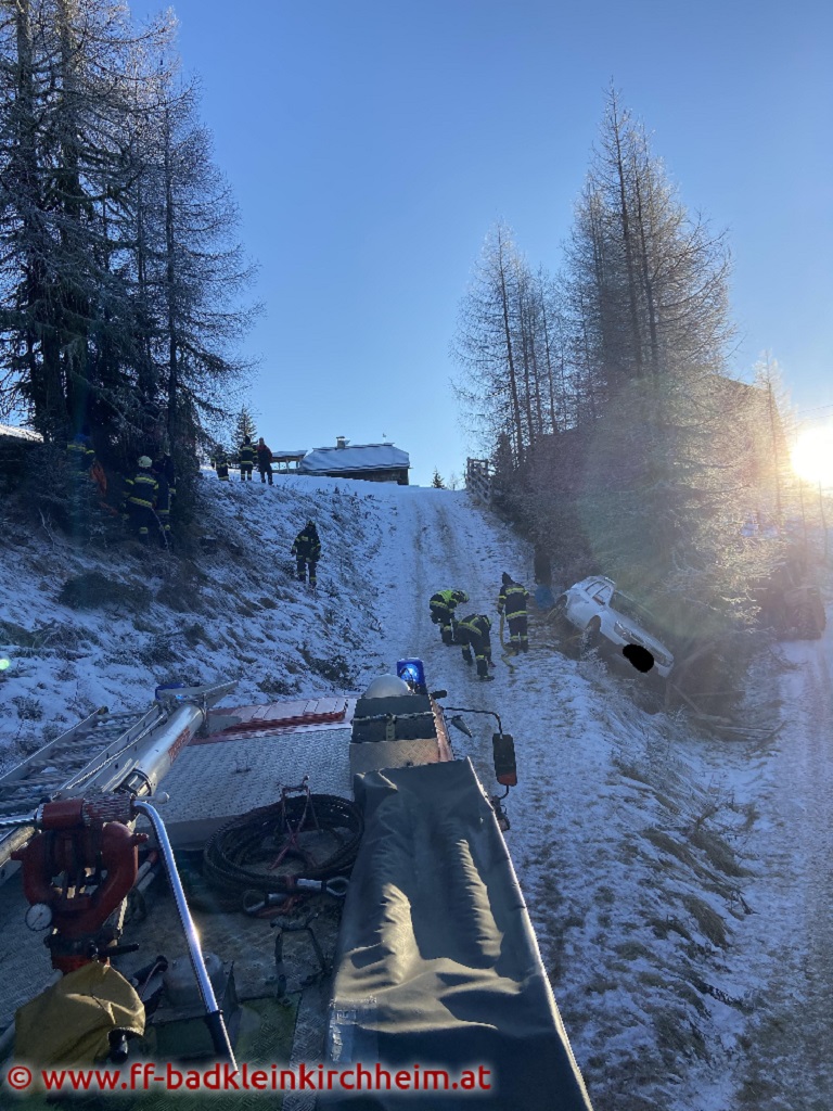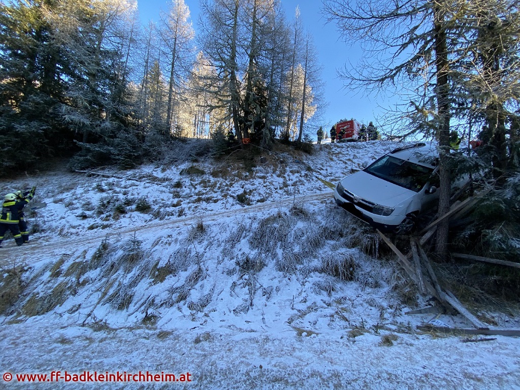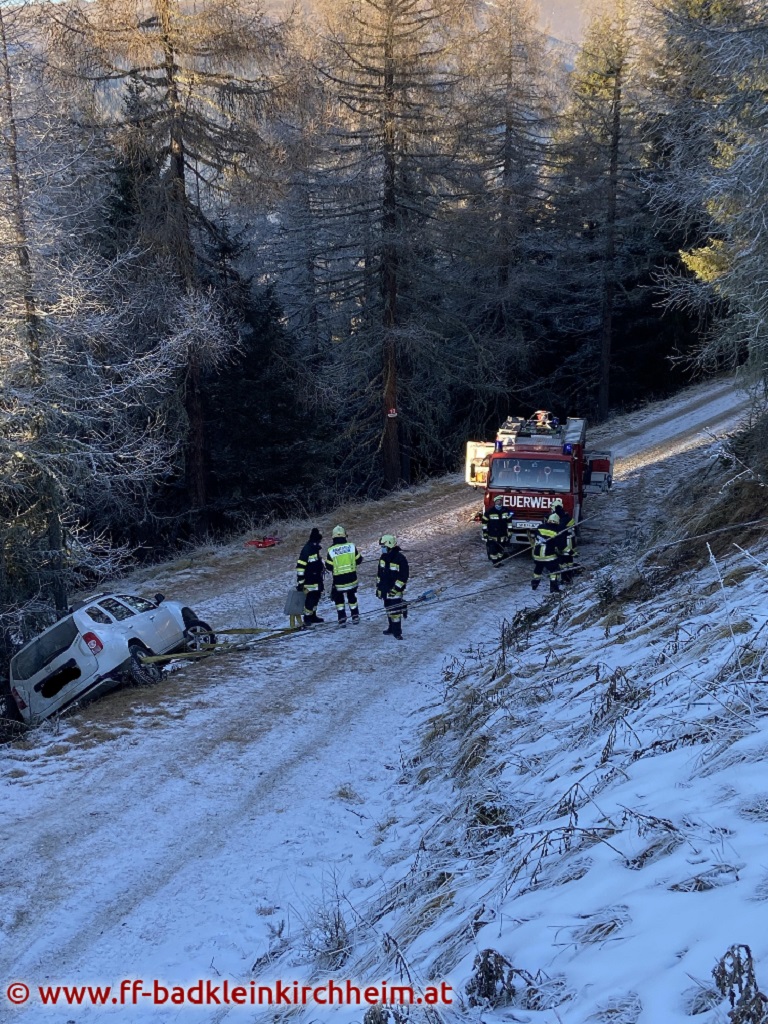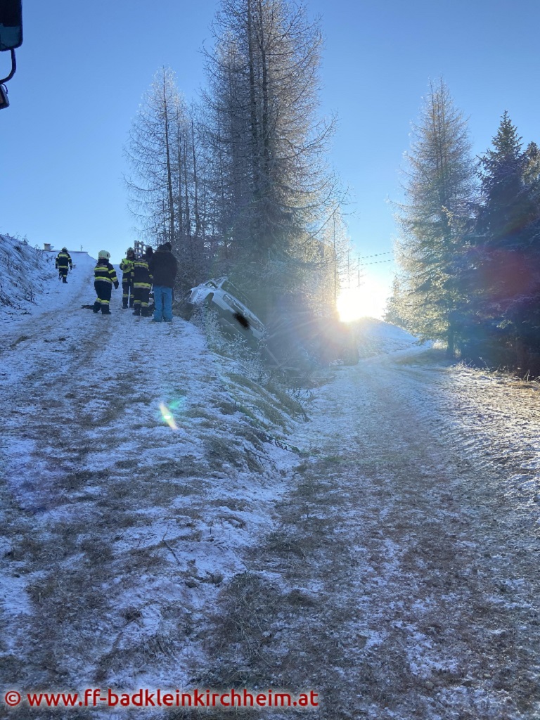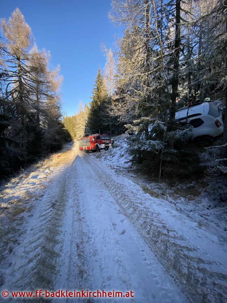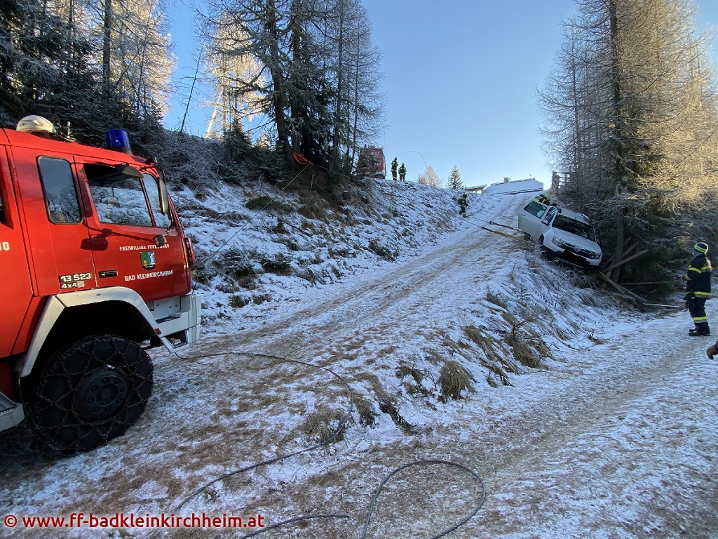 Am 1. Adventsonntag 2020 wurde die Feuerwehr Bad Kleinkirchheim gegen 14:11 Uhr mittels Sirenenalarm zu einer Fahrzeugbergung alarmiert. Ein PKW rutschte auf der Maibrunn (ca. 1800m Seehöhe) von der Fahrbahn über die Böschung ab und blieb in einer Baumgruppe hängen.
