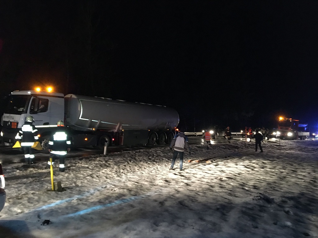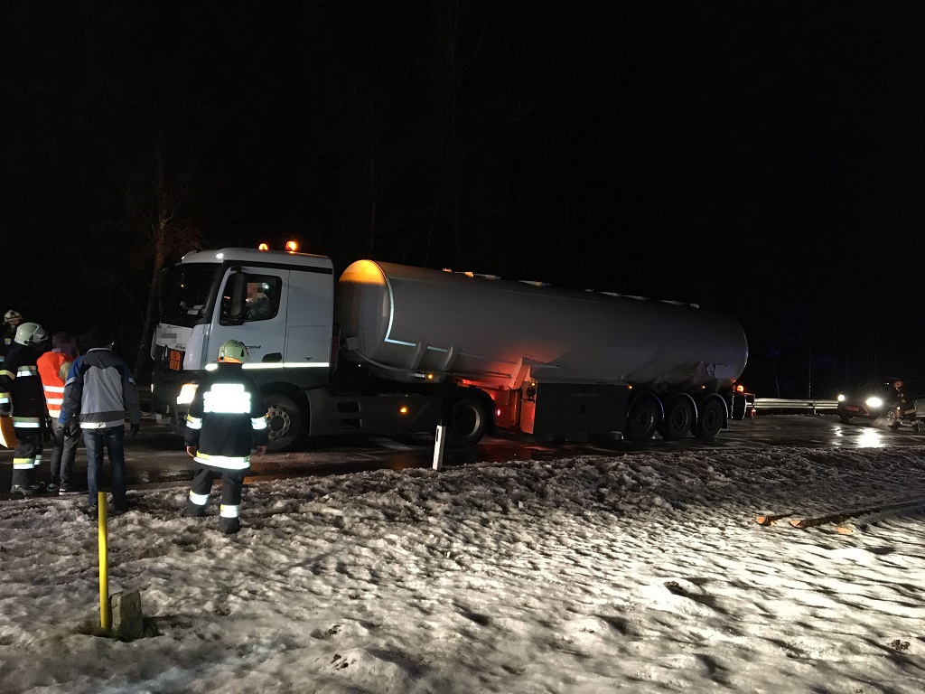 Ein mit Dieselkraftstoff beladener Sattelzug ist auf der vereisten Fahrbahn zum Stillstand gekommen und versperrte die Straße. Die Erstmaßnahmen der Feuerwehren bestanden darin, den Sattelzug mit Unterlegkeilen zu sichern.