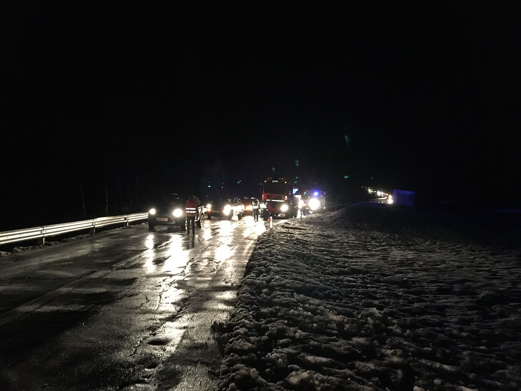 Unter der Mithilfe der Einsatzkräfte der Feuerwehren und des zufällig anfahrenden Streufahrzeuges der Straßenmeisterei konnte die vereiste Fahrbahn mit Salz gestreut werden.