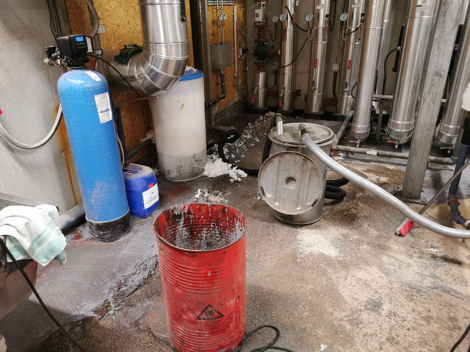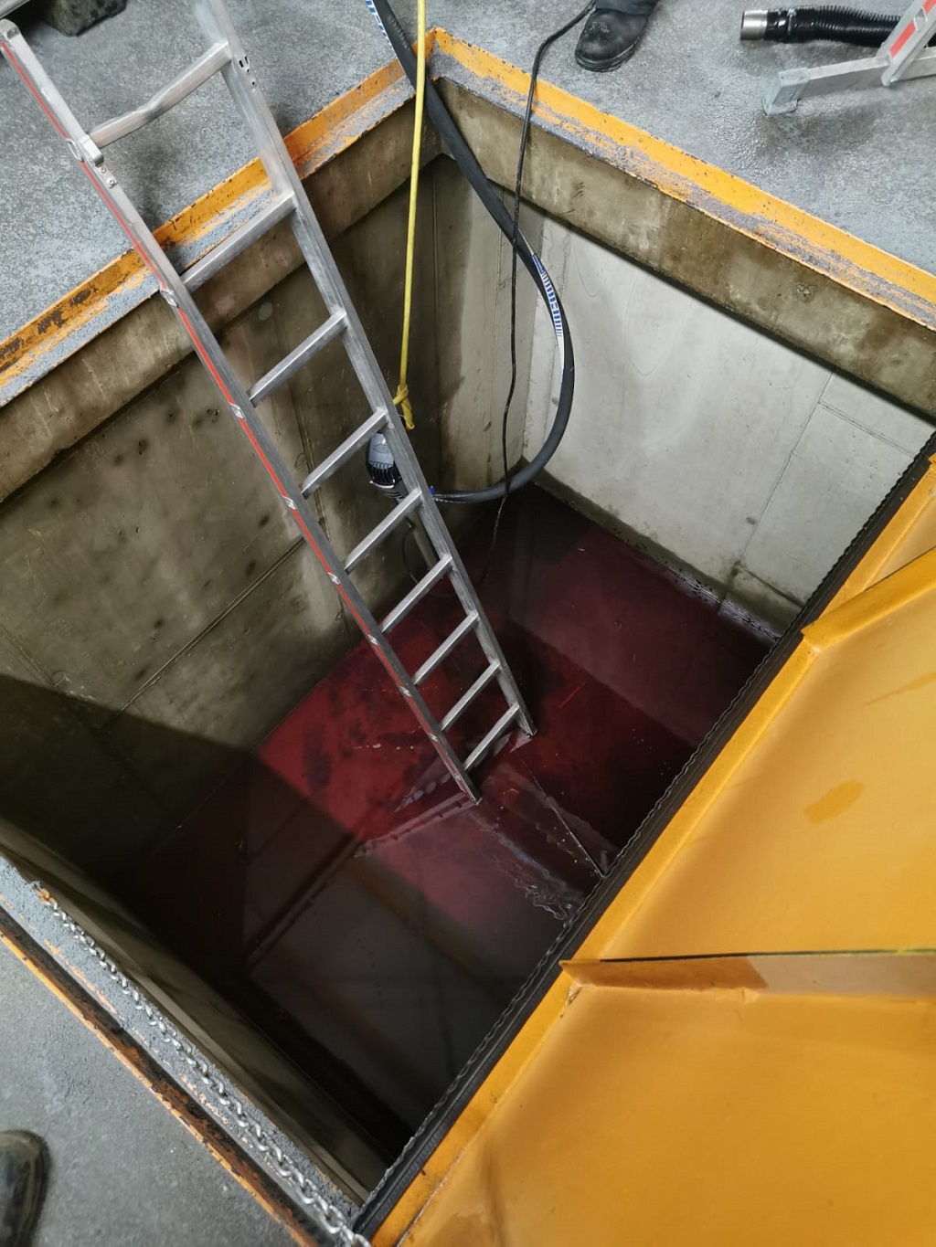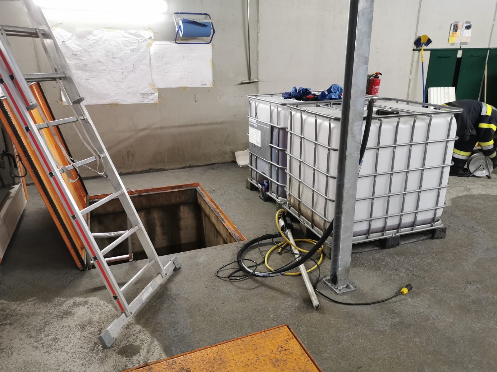 Nach weiterer Erkundung, konnte zum Glück festgestellt werden, dass das Öl nicht aus dem Gebäude austrat, sondern sich in einem Kellerschacht sammelte.