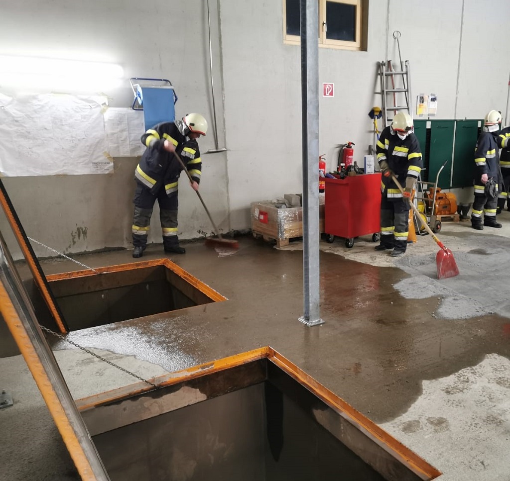 Nach Besichtigung durch den Einsatzleiter der FF Radenthein konnte rasch die Ursache festgestellt und der weitere Heizölabfluss aus dem Tank gestoppt werden. Das Öl floss über einen Teil der Halle weiter und verschwand auf zunächst noch unbekannte Weise.
