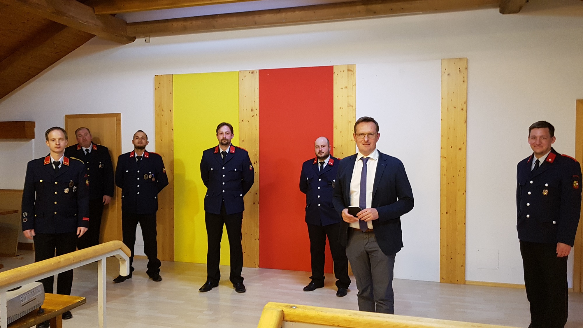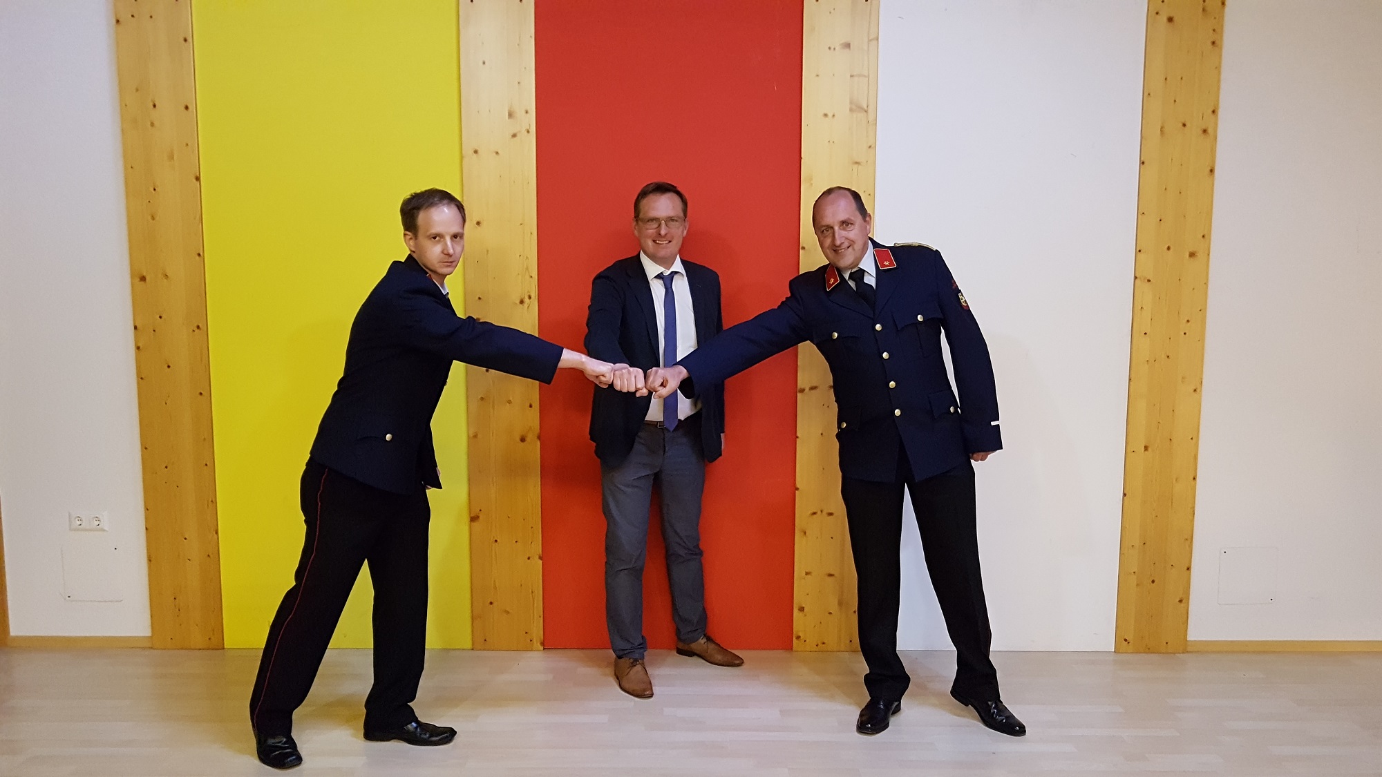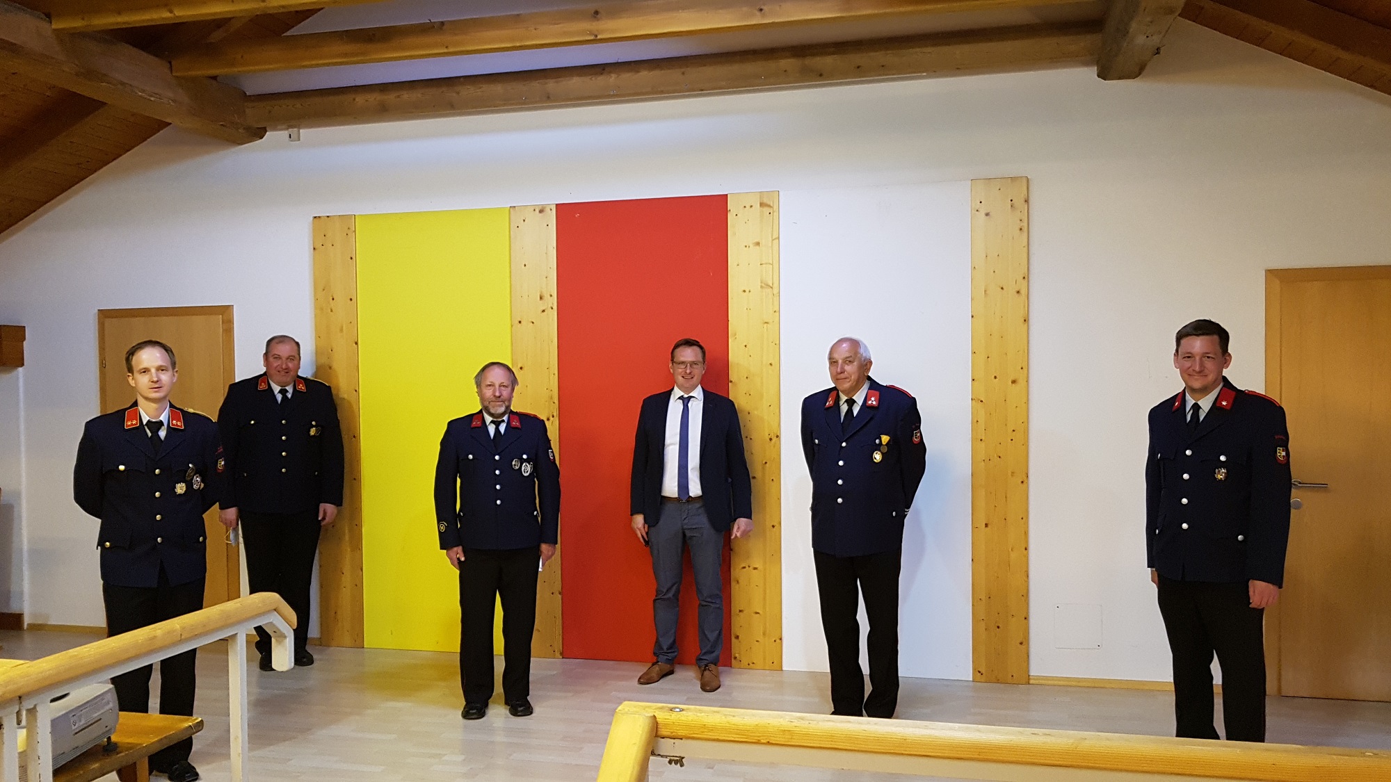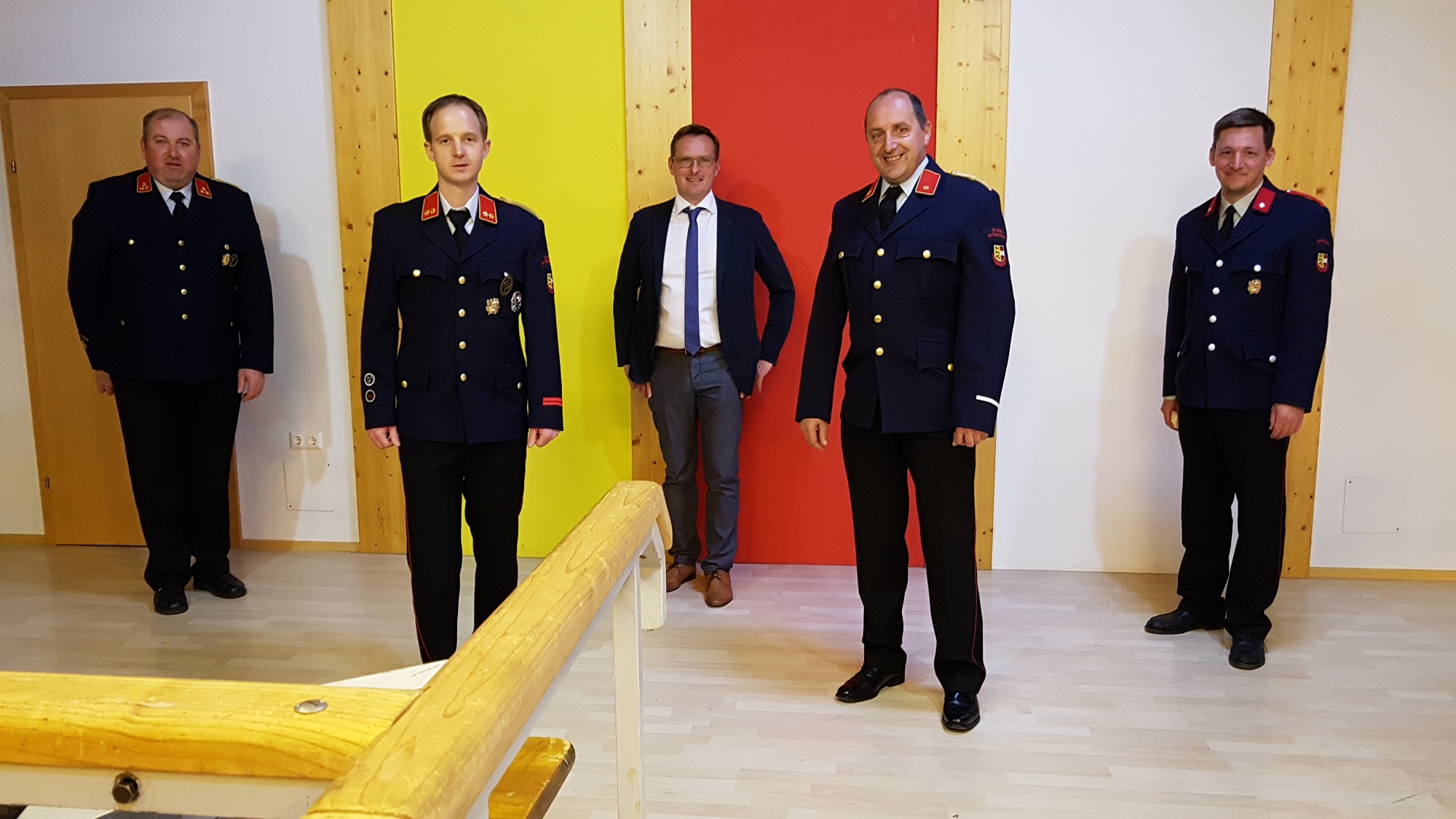 Kommandant OBI Mario Wilpernig begrüßte Bürgermeister Michael Maier, Vizebürgermeister Armin Egger, Gemeindefeuerwehrkommandant HBI Jürgen Hernler, sowie die Sachbearbeiterin Marina Reinwald.