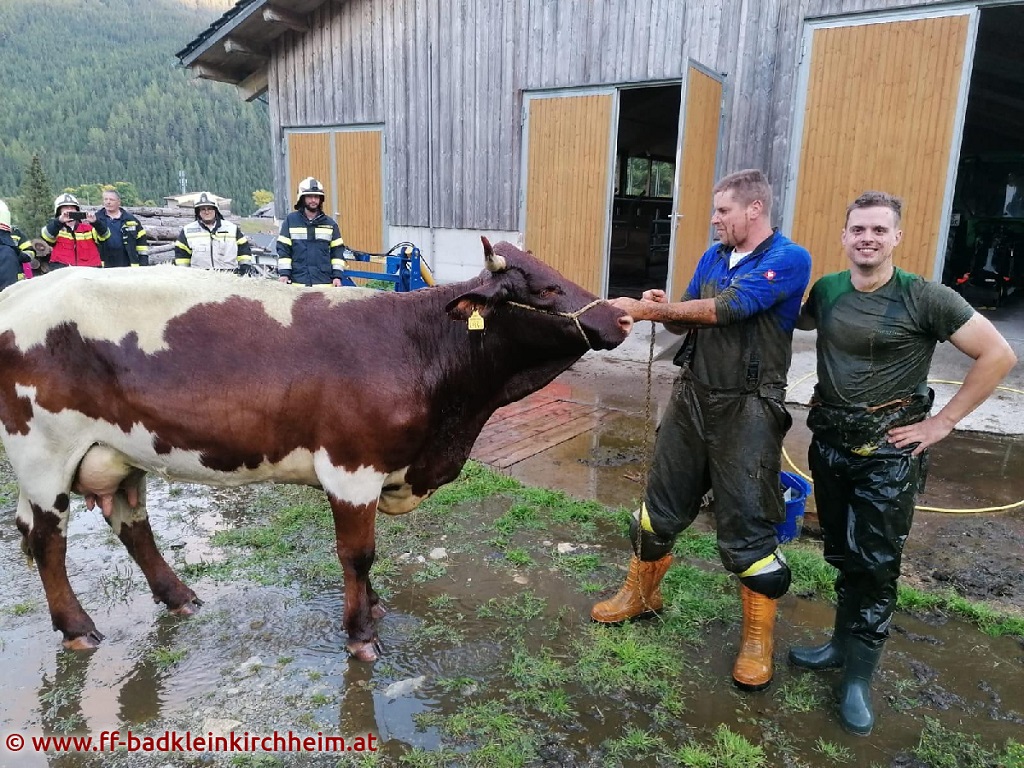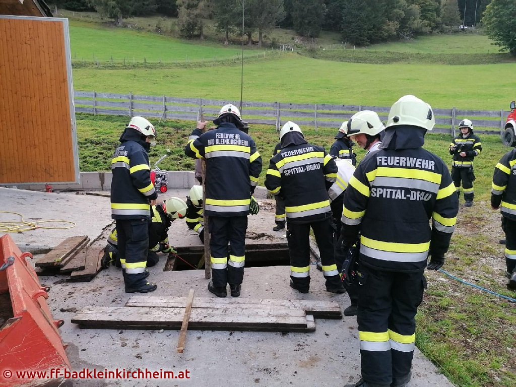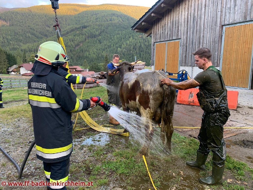 Die ca 600kg schwere Kuh wurde vom Landwirt in der ca. 1 Meter hoch, mit Gülle gefüllten, Grube eingefangen und im Anschluss daran mit dem Kran des SRFK Spittal und einem Tierbergegurt aus der Grube gehoben. Die Kuh überstand den Absturz sowie die Rettung unverletzt.