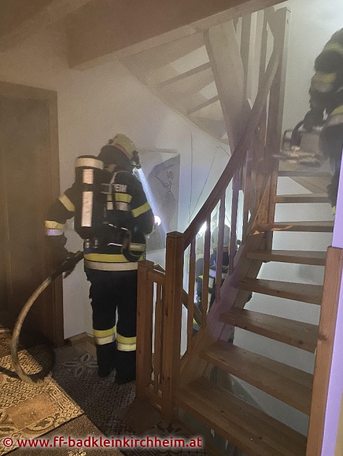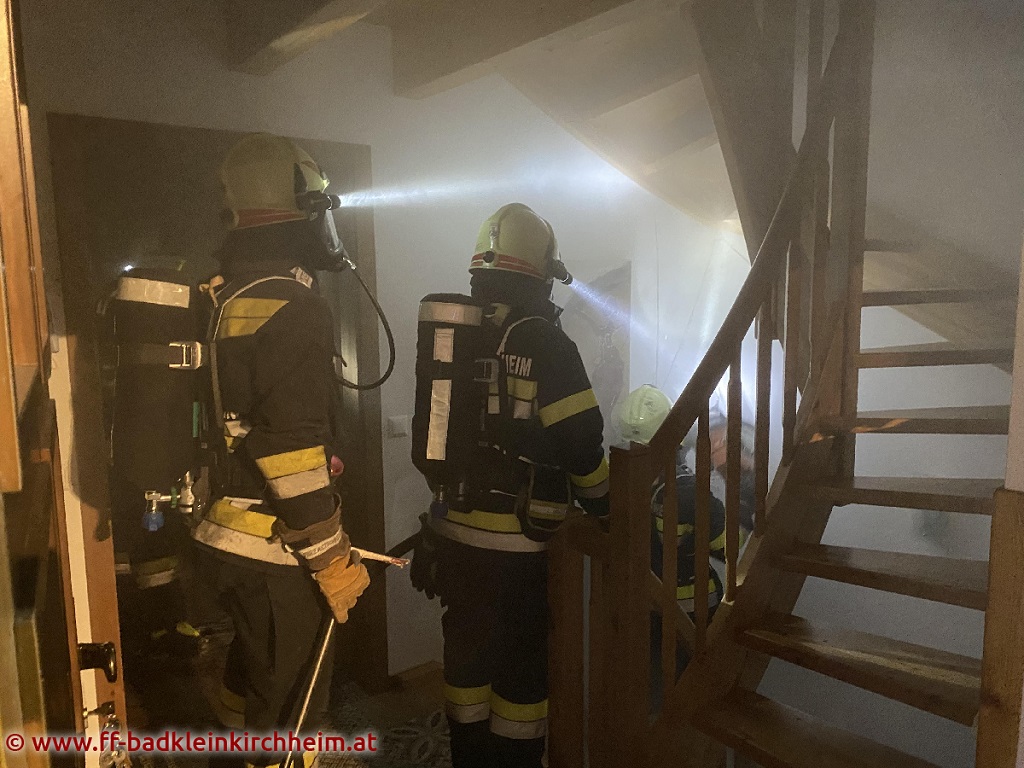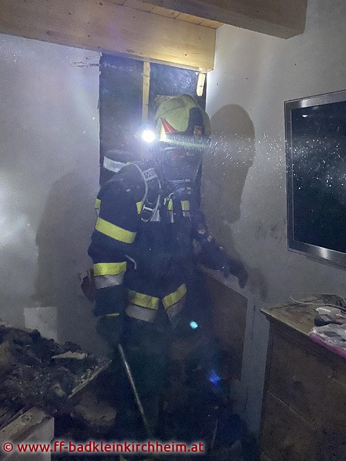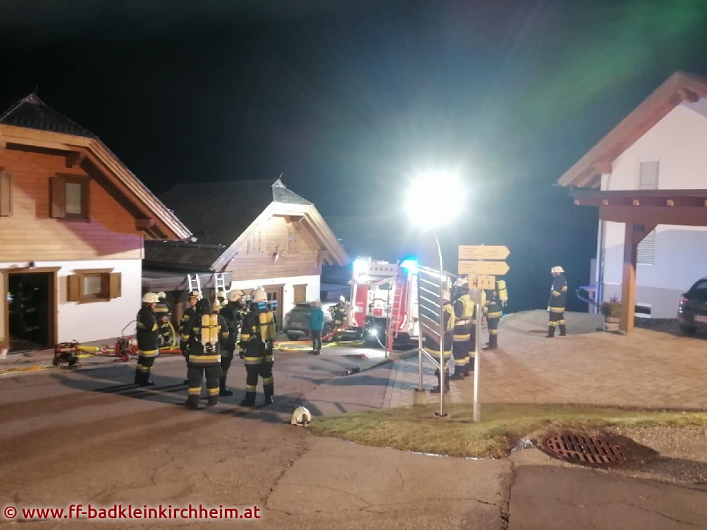 An der Einsatzstelle konnte ein ausgedehnter Zwischenwandbrand im Bereich einer Feuerstätte im Erdgeschoss festgestellt werden. Das gesamte Gebäude war sehr stark verraucht. Personen waren glücklicherweise keine mehr im Gebäude, jedoch war der Hund der Familie im verrauchten Obergeschoß eingeschlossen. Aufgrund der Schadenslage wurde vom Einsatzleiter die Nachalarmierung der Feuerwehren St. Peter ob Radenthein und Patergassen veranlasst. Ein Atemschutztrupp der FF Bad Kleinkirchheim drang in das Obergeschoß zur Rettung des Hundes vor. Der Hund konnte rasch gefunden und ins Freie gebracht werden.
