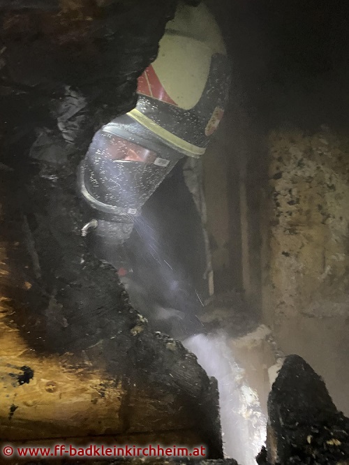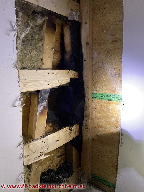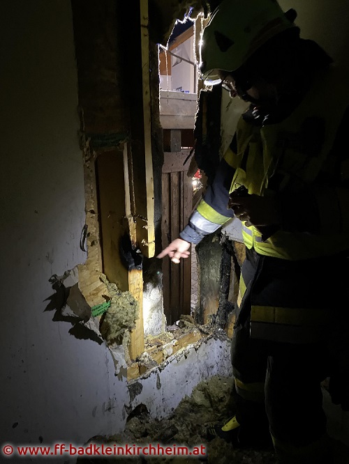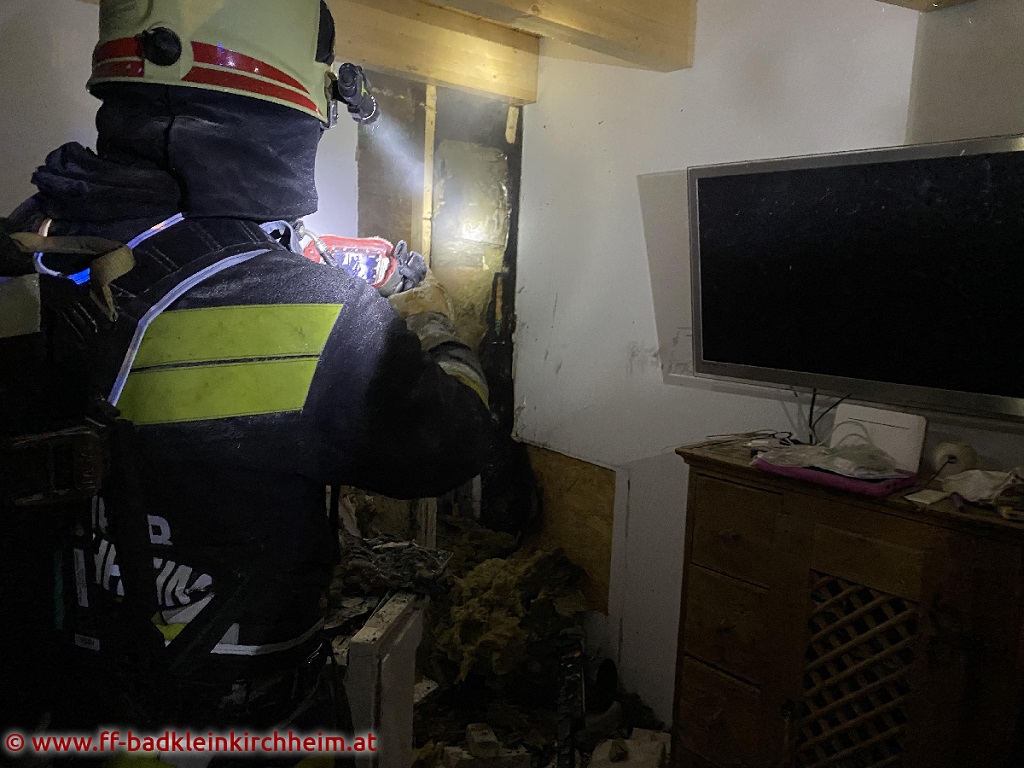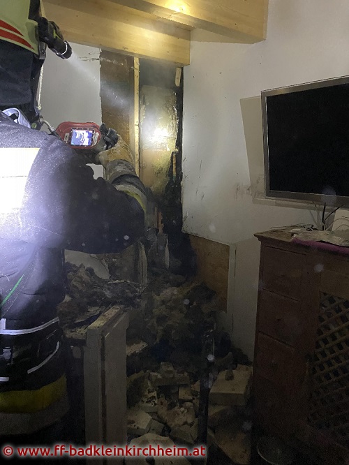 Nach der Tierrettung wurde die Brandbekämpfung eingeleitet. Für diesen Zweck wurden die im Bereich der Feuerstätte befindlichen Wände unter Einsatz von Rettungssäge und Wärmebildkamera geöffnet und der vorhandene Brand abgelöscht. Parallel wurden im Außenbereich eine weitere Löschleitung aufgebaut, um einen möglichen Brandübergriff auf die Außenhülle des Gebäudes bzw. das angebaute Carport zu verhindern.