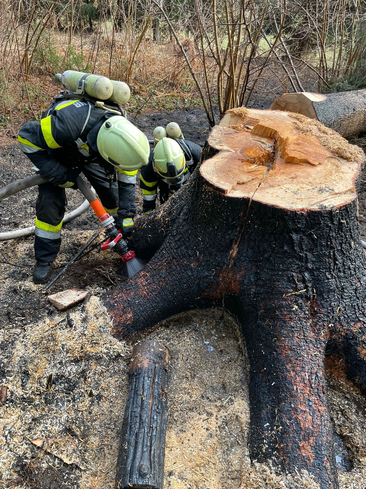 Ein ganz markanter, fast hundert Jahre alter Nadelbaum musste gefällt werden, weil er ausgehend vom Inneren des Wurzelstocke massiv zu brennen begonnen hatte. Bis 18:30 Uhr wurden sämtliche erkennbaren Glutnester aufgegraben, abgelöscht und der Einsatz konnte beendet werden.
