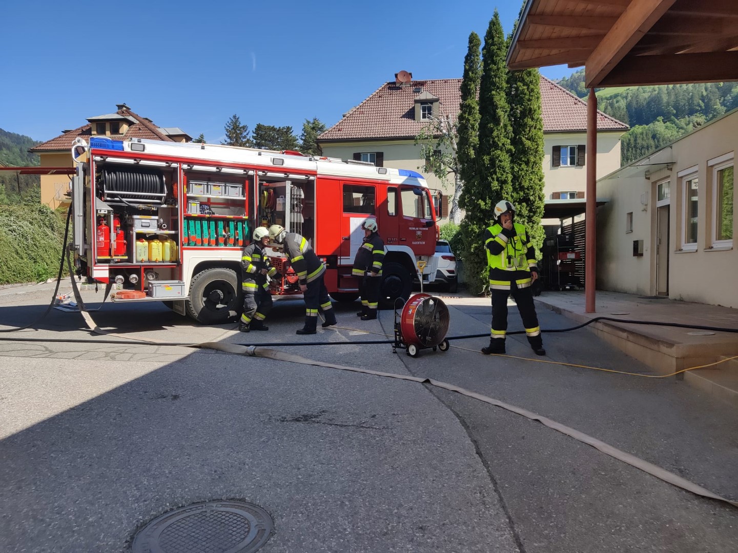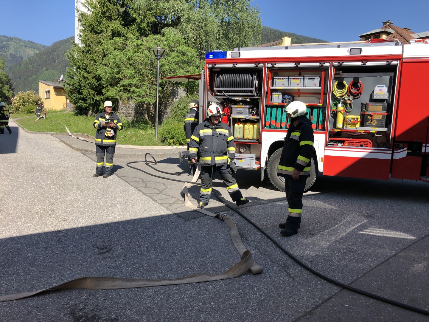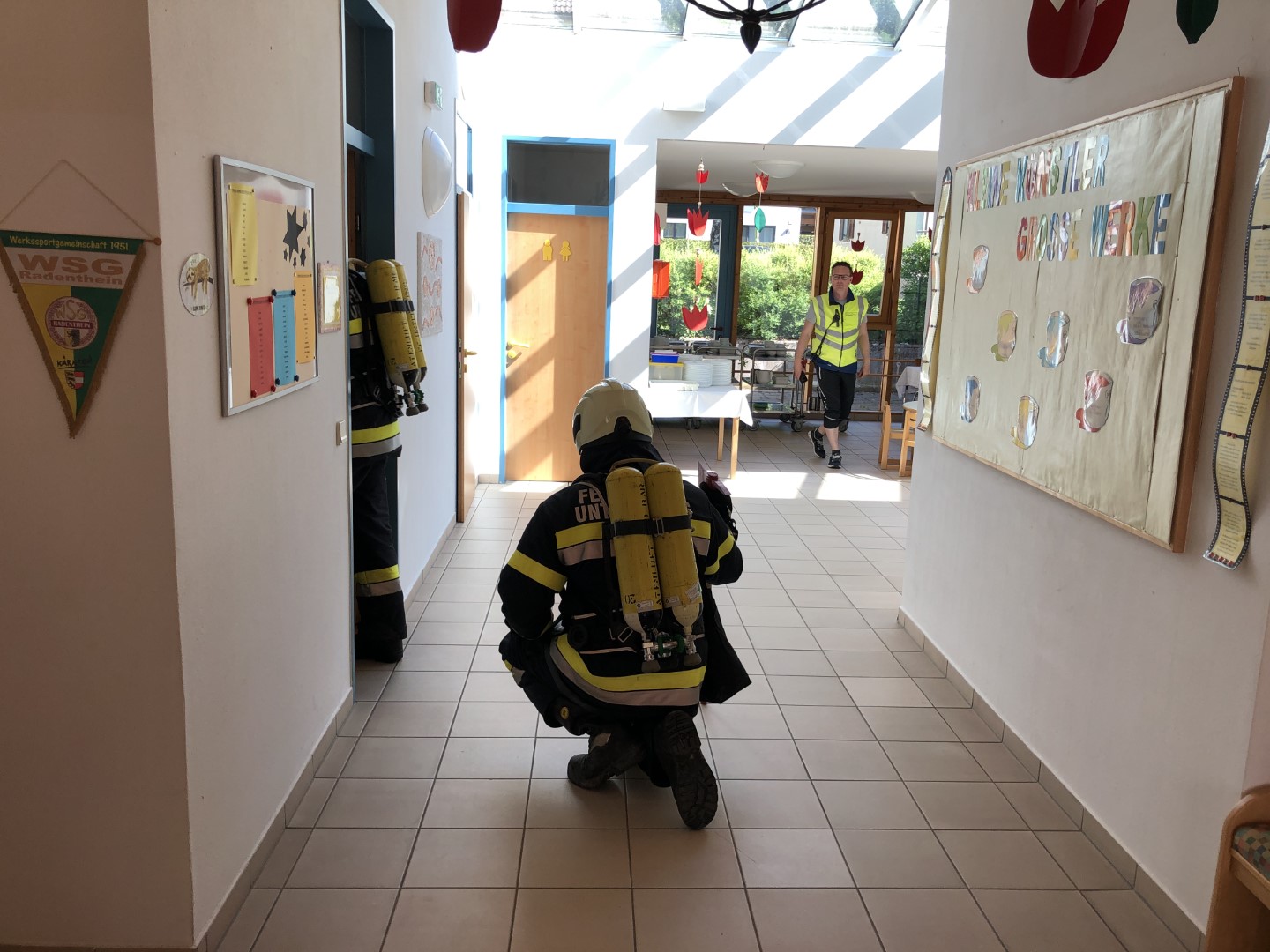 Als die ersten Fahrzeuge der alarmierten Feuerwehren der Stadtgemeinde Radenthein eintrafen, war das Gebäude fast vollständig geräumt. Im Zuge der Anwesenheitskontrolle wurde festgestellt, dass eine Mitarbeiterin noch vermisst wird. Mehrere Atemschutztrupps durchsuchten den Kindergarten nach der Person und kontrollierten nochmals alle Räumlichkeiten. Um die Wasserversorgung sicherzustellen, wurde parallel dazu eine Förderleitung vom Riegerbach zum Einsatzobjekt aufgebaut. Nach knapp einer Stunde konnte die Übung beendet werden.
