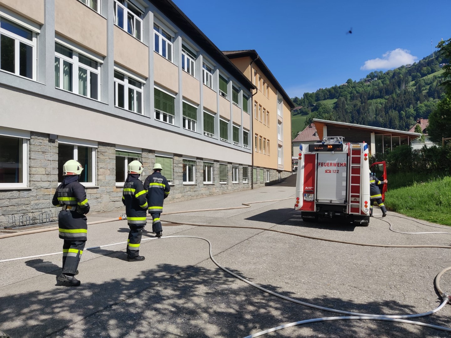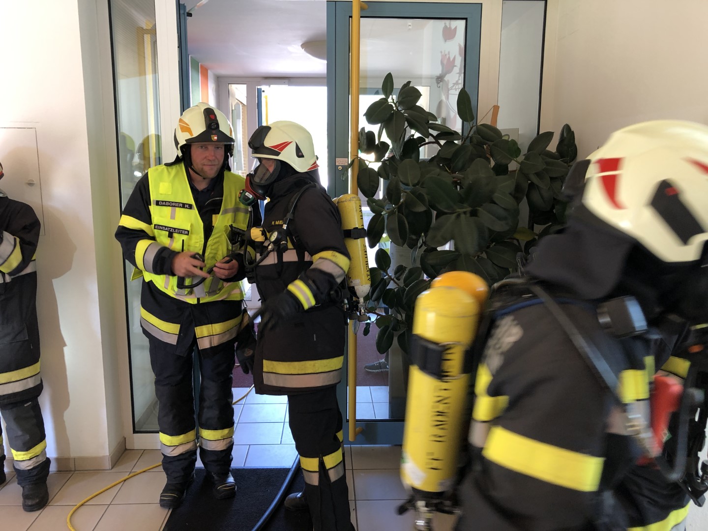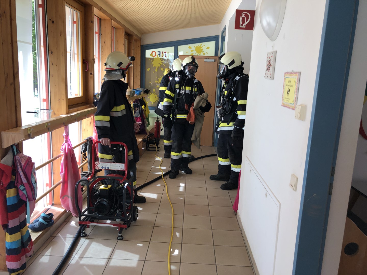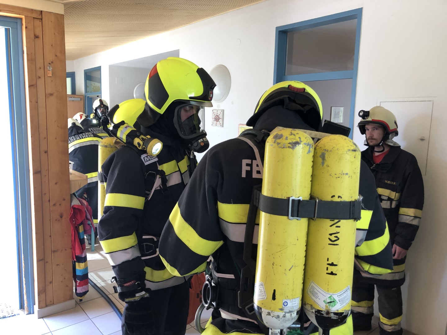 Als die ersten Fahrzeuge der alarmierten Feuerwehren der Stadtgemeinde Radenthein eintrafen, war das Gebäude fast vollständig geräumt. Im Zuge der Anwesenheitskontrolle wurde festgestellt, dass eine Mitarbeiterin noch vermisst wird. Mehrere Atemschutztrupps durchsuchten den Kindergarten nach der Person und kontrollierten nochmals alle Räumlichkeiten. Um die Wasserversorgung sicherzustellen, wurde parallel dazu eine Förderleitung vom Riegerbach zum Einsatzobjekt aufgebaut. Nach knapp einer Stunde konnte die Übung beendet werden.