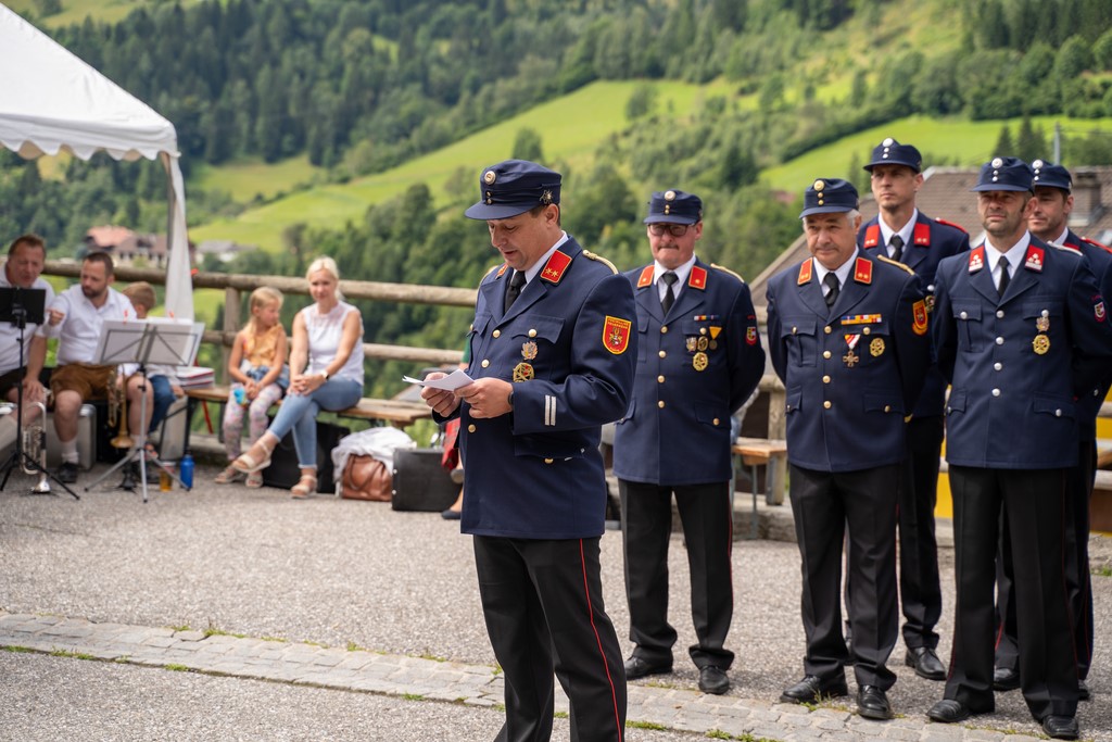 Kommandant OBI Michael Erlacher durfte zum Festakt neben zahlreichen Bewohnerinnen und Bewohner des Ortes, Kameradinnen und Kameraden der umliegenden Feuerwehren und der Partnerfeuerwehr Berglern (Bayern) auch Bürgermeister Michael Maier, Vizebürgermeister Armin Egger, Abschnittsfeuerwehrkommandant BR Christian Göckler und Gemeindefeuerwehrkommandant HBI Hannes Daborer begrüßen.