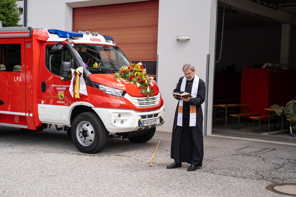 Nach der Ankunft und offiziellen Schlüsselübergabe durch den Bürgermeister segnete Pfarrer Krzysztof Miera das neue Löschfahrzeug. Die Patenschaft für das neue LFA übernehmen Marina Reinwald und Andrea Pontasch. Zur Erinnerung an den von Kameradinnen und Kameraden liebgewonnen und mit viel Herzblut gepflegten Unimog übergaben die beiden ein Bild des alten Fahrzeuges.