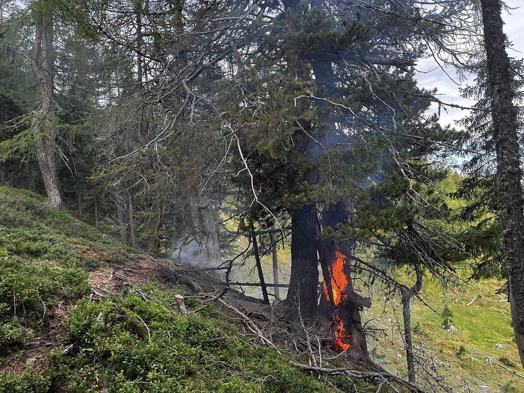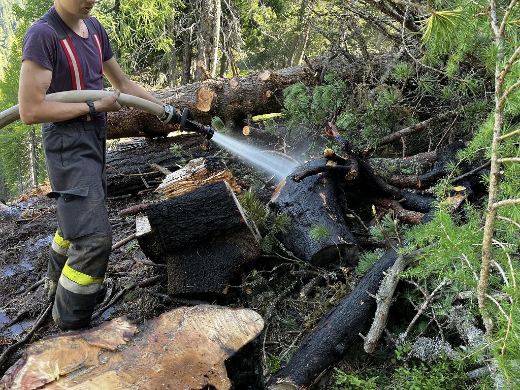 Eine Erkundung unmittelbar vor Ort zeigte den Brand mehrerer Bäume ca. 200 m vom Weg entfernt. Nach ersten Löscharbeiten wurden zwei Bäume mit Hubzugunterstützung gefällt. In Folge wurden die Wurzelstöcke sukzessive abgetragen, um an die Glutnester zu gelangen. Weiteres wurde das gesamte Umfeld mittels Schanzwerkzeug aufgegraben und mit 10.000 lt. Löschwasser getränkt. Abschließend wurde der Bereich noch mittels Wärmebildkamera kontrolliert und mittels Bioversal benetzt.
