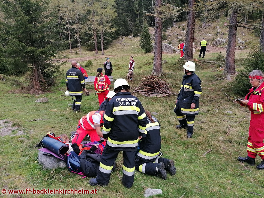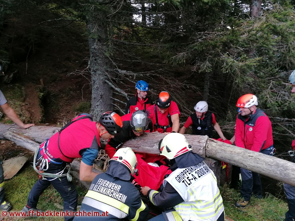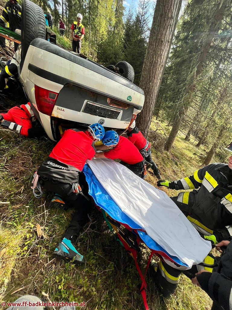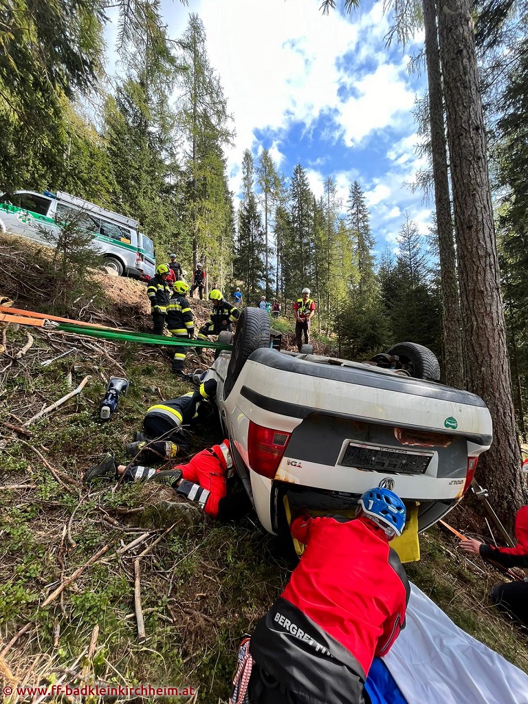 Angenommen wurde folgende Schadenslage: Eine männliche Person einer fünf-köpfigen Gruppe stürzte in einem Waldstück im Bereich des Güterweges rund sieben Meter über eine Felswand und blieb mit schweren Verletzungen auf einem Felsvorsprung liegen. Die restlichen Mitglieder der Gruppe, die zum Teil alkoholisiert waren, verließen zu Fuß bzw. mit einem Fahrzeug die Unfallstelle, um die Rettungskette in Gang zu setzen, da ein Notruf via Handy nicht möglich war. In Folge kam das Fahrzeug vom Güterweg ab, überschlug sich und blieb auf dem Dach liegen. Eine Person wurde im Fahrzeug eingeklemmt, eine weitere Person rannte im Schock davon. Ohrenzeugen verständigten die Einsatzkräfte.