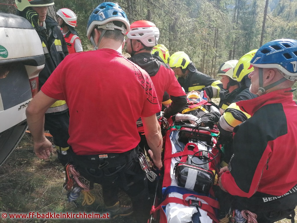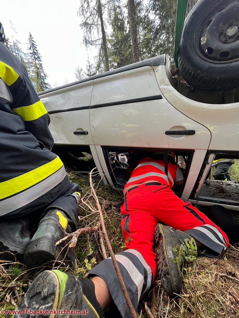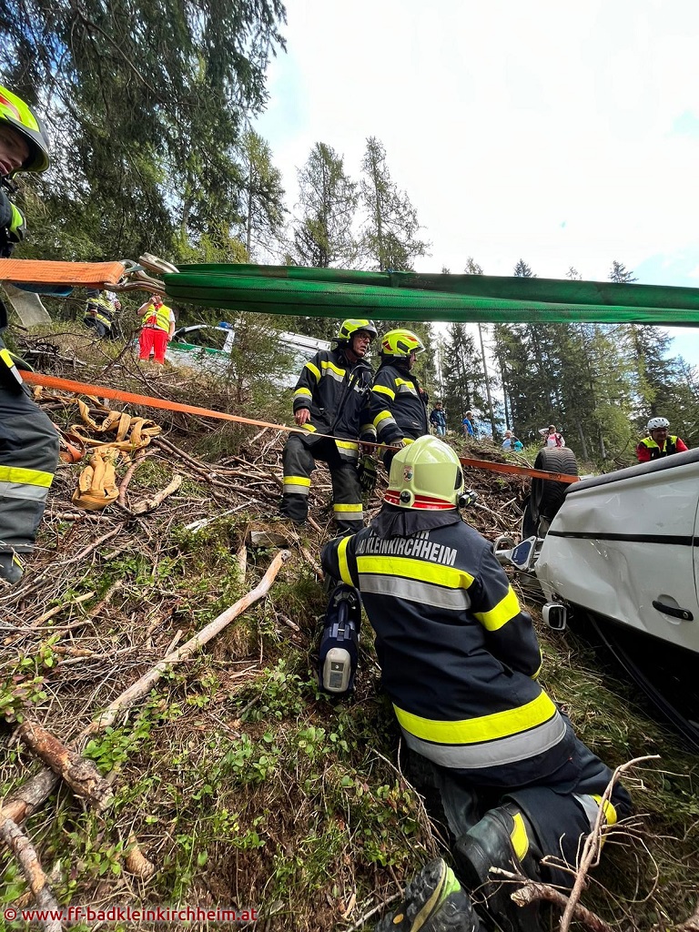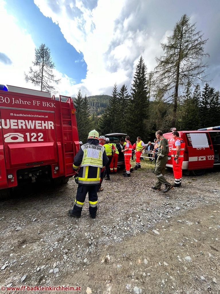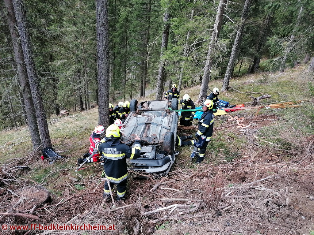 Rund zehn Minuten nach der Alarmierung traf TLFA 2000 Bad Kleinkirchheim am verunfallten Fahrzeug ein. Die Mannschaft stellte zunächst den Brandschutz her und betreute die eingeklemmte Person. Die Sicherung des Unfallfahrzeuges und die Personenrettung wurden in Folge durch RLFA 3000 Bad Kleinkirchheim und die Mitglieder der Bergrettung durchgeführt. Im Zuge der Einsatzmaßnahmen gab es Hinweise auf weitere beteiligte Personen.