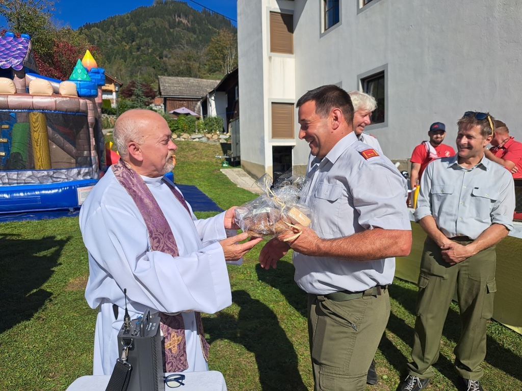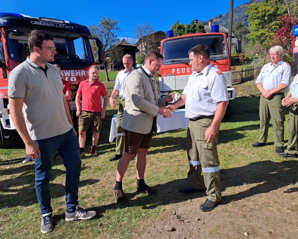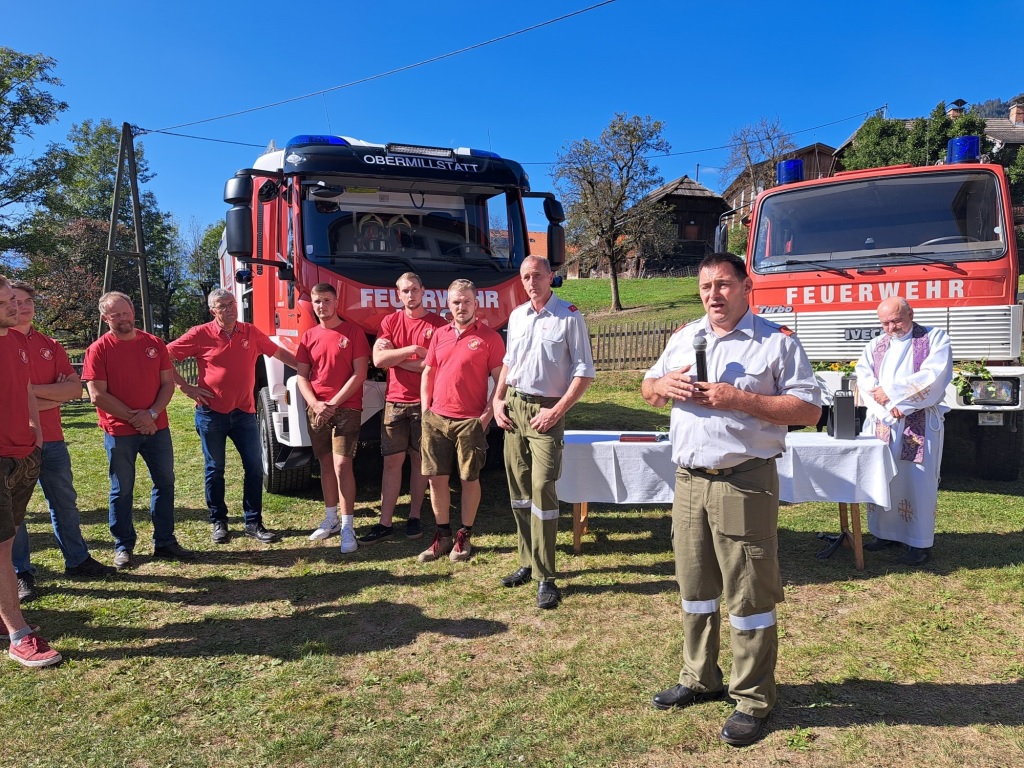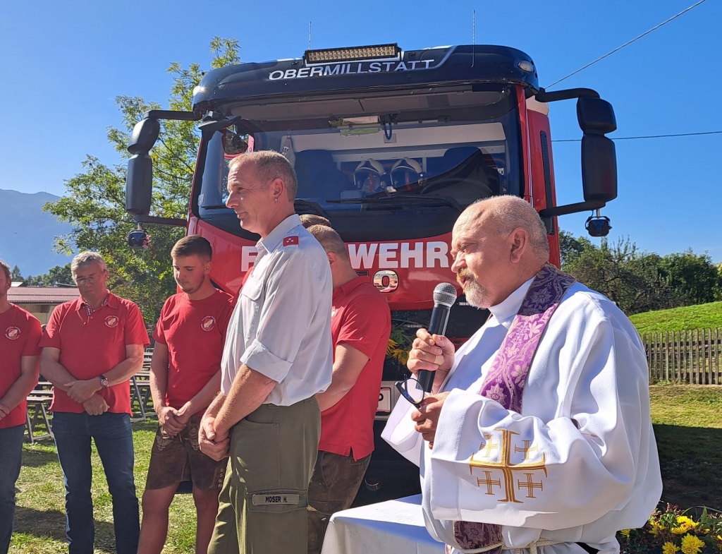 Die Fahrzeugsegnung wurde von Pater Wladyslaw Tomasz Mach durchgeführt wobei er auch ausdrücklich und mit Humor erwähnte das sein Weihwasser hoffentlich nicht zu vorzeitiger Korrosion führt! Die Schlüsselübergabe für das neue Einsatfahrzeug wurden in Vertretung für den Bürgermeister der Gemeinde Millstatt von Gemeindevorstand Mag. Norbert Santner und Finanzrefernenten Christoph Tuppinger übergeben. Ebenfalls anwesend waren auch Abschnittsfeuerwehrkommandant Christian Göckler sowie Gemeindefeuerwehrkommandant Hannes Zeber.