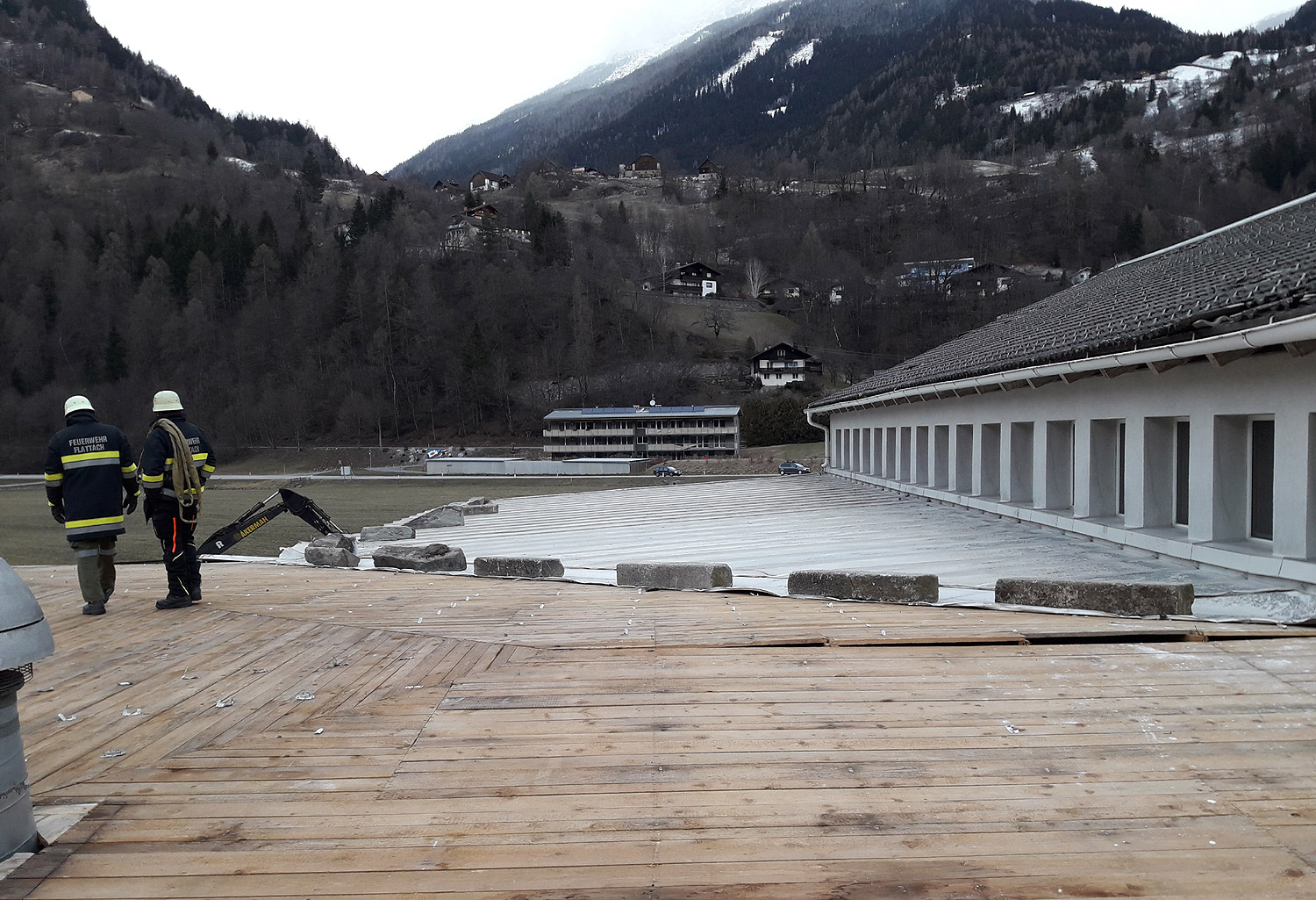 Da der Wind immer wieder auf kam, war es sehr gefährlich diese Platten zu sichern. Mit zwei Radladern, bedient von zwei Feuerwehr Kameraden, gelang uns dies auch. Leider wurde ein Kamerad, von einer dieser Platten am Kopf getroffen, er wurde vom RK. in das KH-Spittal gebracht. Dank Helm, war die Verletzung jedoch nicht so schwer, so dass er das KH. noch in der Nacht verlassen konnte. Im Einsatz waren 16 Frauen u. Männer der FF. Flattach-Fragant, 1 TLFA und 2 KLFA, sowie PI. Obervellach und RK. Obervellach. (Bild 1,2)